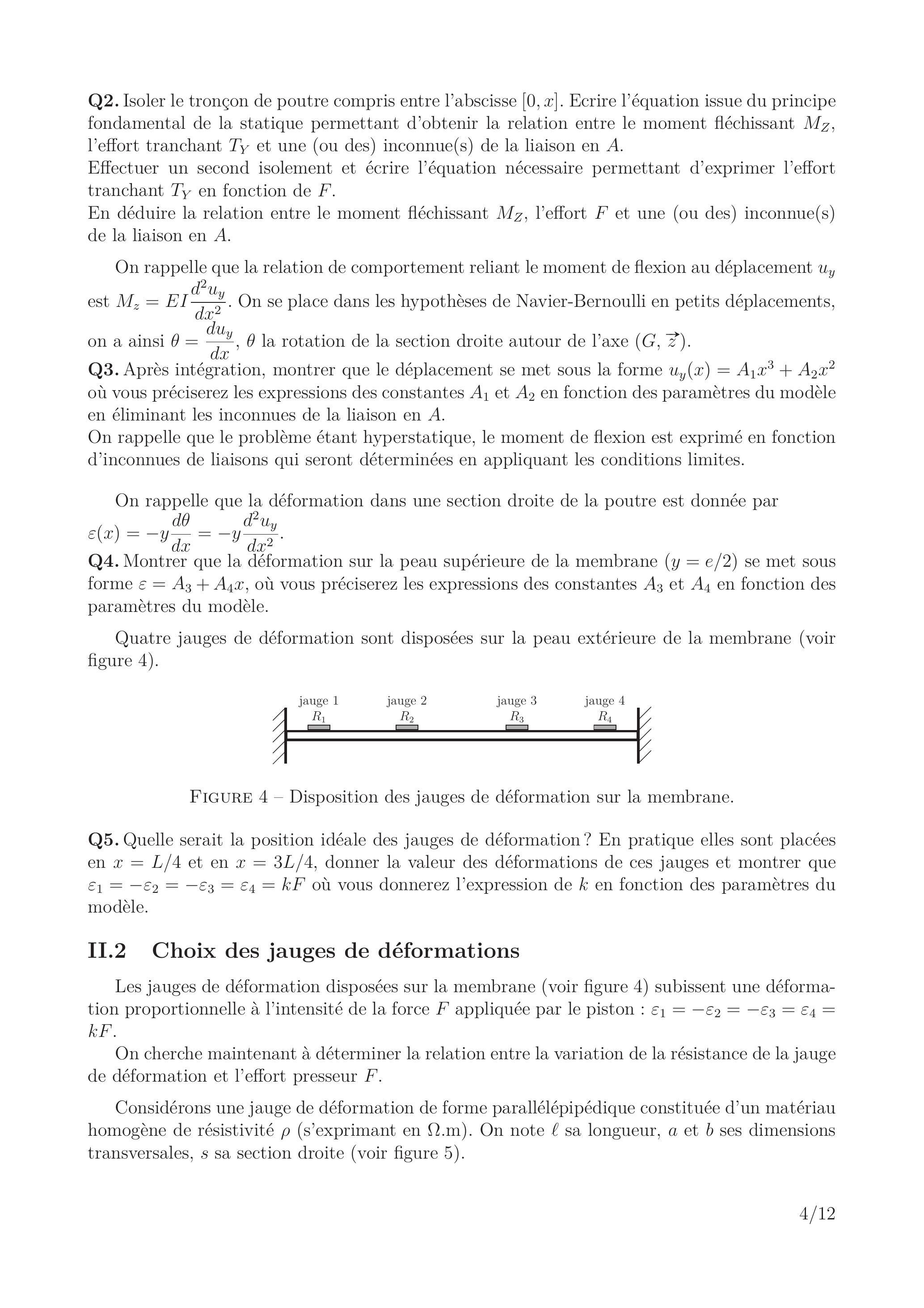 Q5. Quelle serait la position idéale des jauges de déformation? En pratique elles sont placées en et en , donner la valeur des déformations de ces jauges et montrer que où vous donnerez l'expression de en fonction des paramètres du modèle.