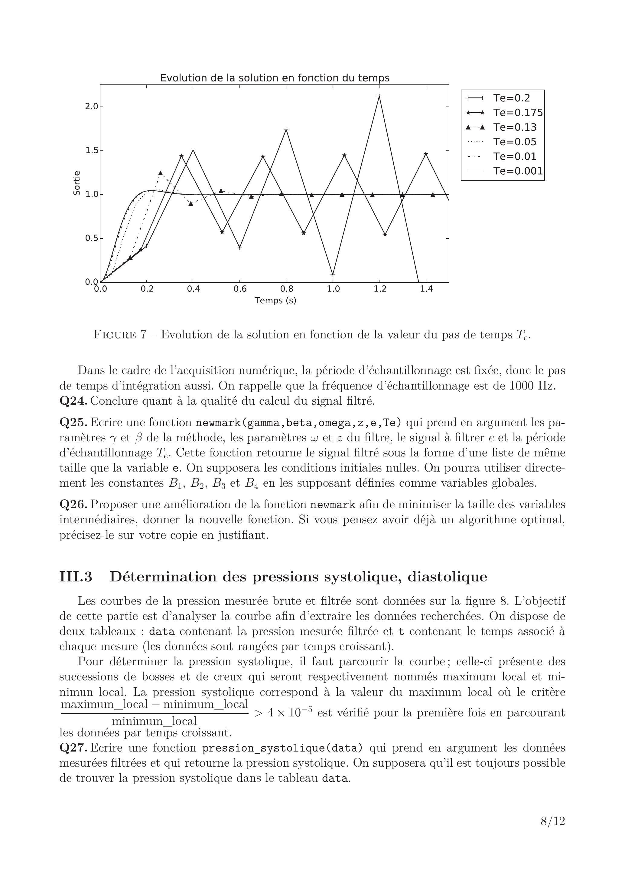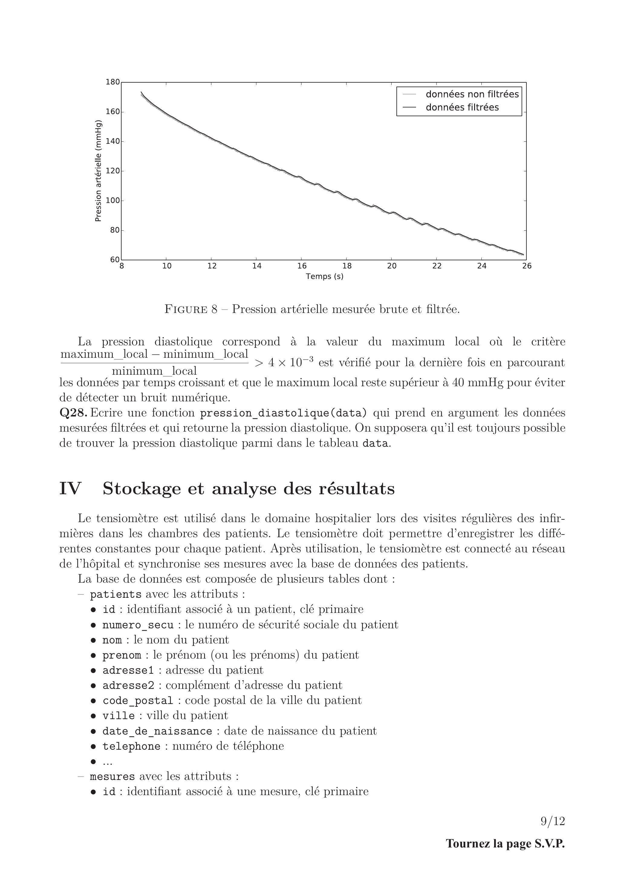 Q28. Ecrire une fonction pression_diastolique(data) qui prend en argument les données mesurées filtrées et qui retourne la pression diastolique. On supposera qu'il est toujours possible de trouver la pression diastolique parmi dans le tableau data.