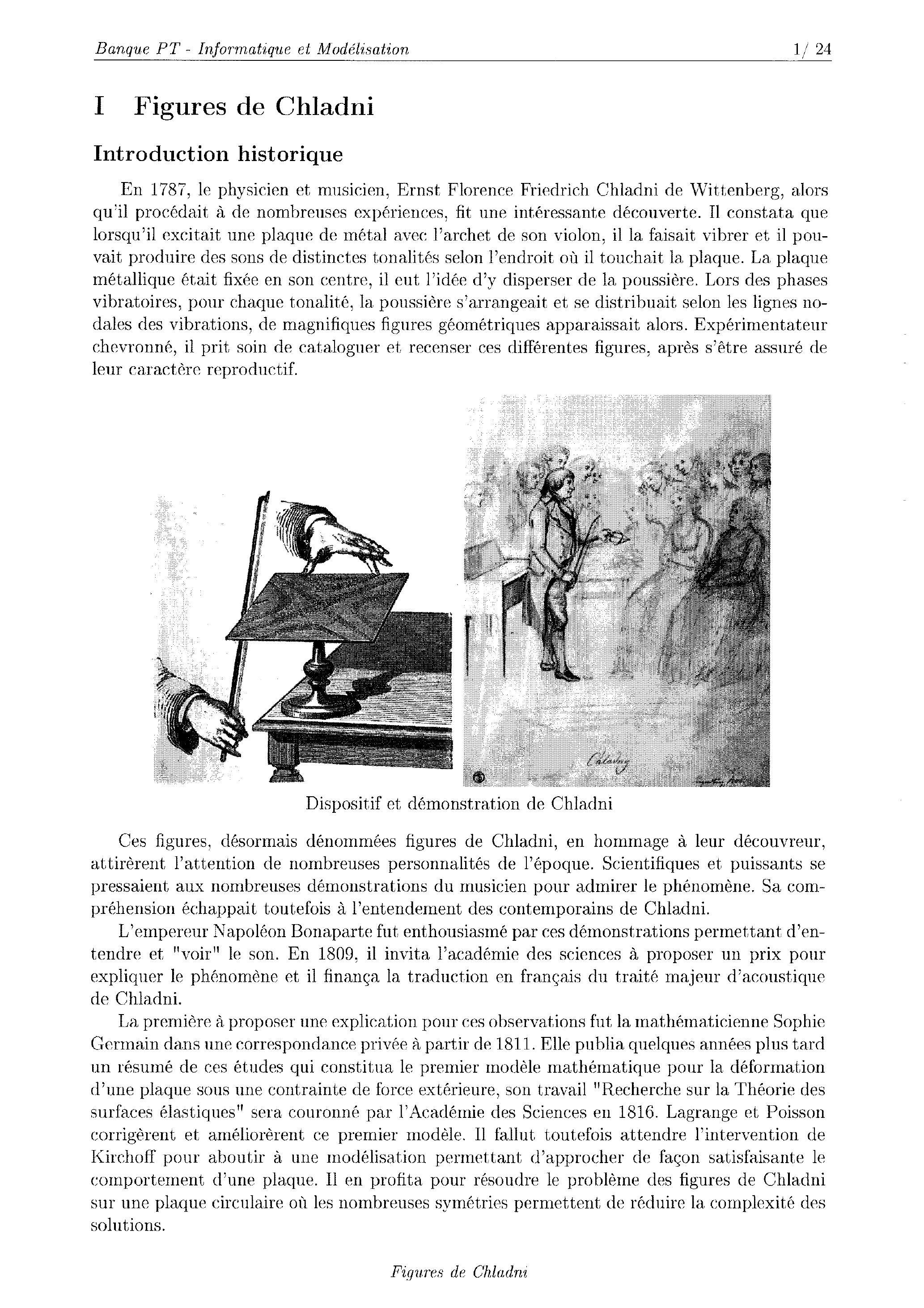 En 1787, le physicien et musicien, Ernst Florence Friedrich Chladni de Wittenberg, alors qu'il procédait à de nombreuses expériences, fit une intéressante découverte. Il constata que lorsqu'il excitait une plaque de métal avec l'archet de son violon, il la faisait vibrer et il pouvait produire des sons de distinctes tonalités selon l'endroit où il touchait la plaque. La plaque métallique était fixée en son centre, il eut l'idée d'y disperser de la poussière. Lors des phases vibratoires, pour chaque tonalité, la poussière s'arrangeait et se distribuait selon les lignes nodales des vibrations, de magnifiques figures géométriques apparaissait alors. Expérimentateur chevronné, il prit soin de cataloguer et recenser ces différentes figures, après s'être assuré de leur caractère reproductif.