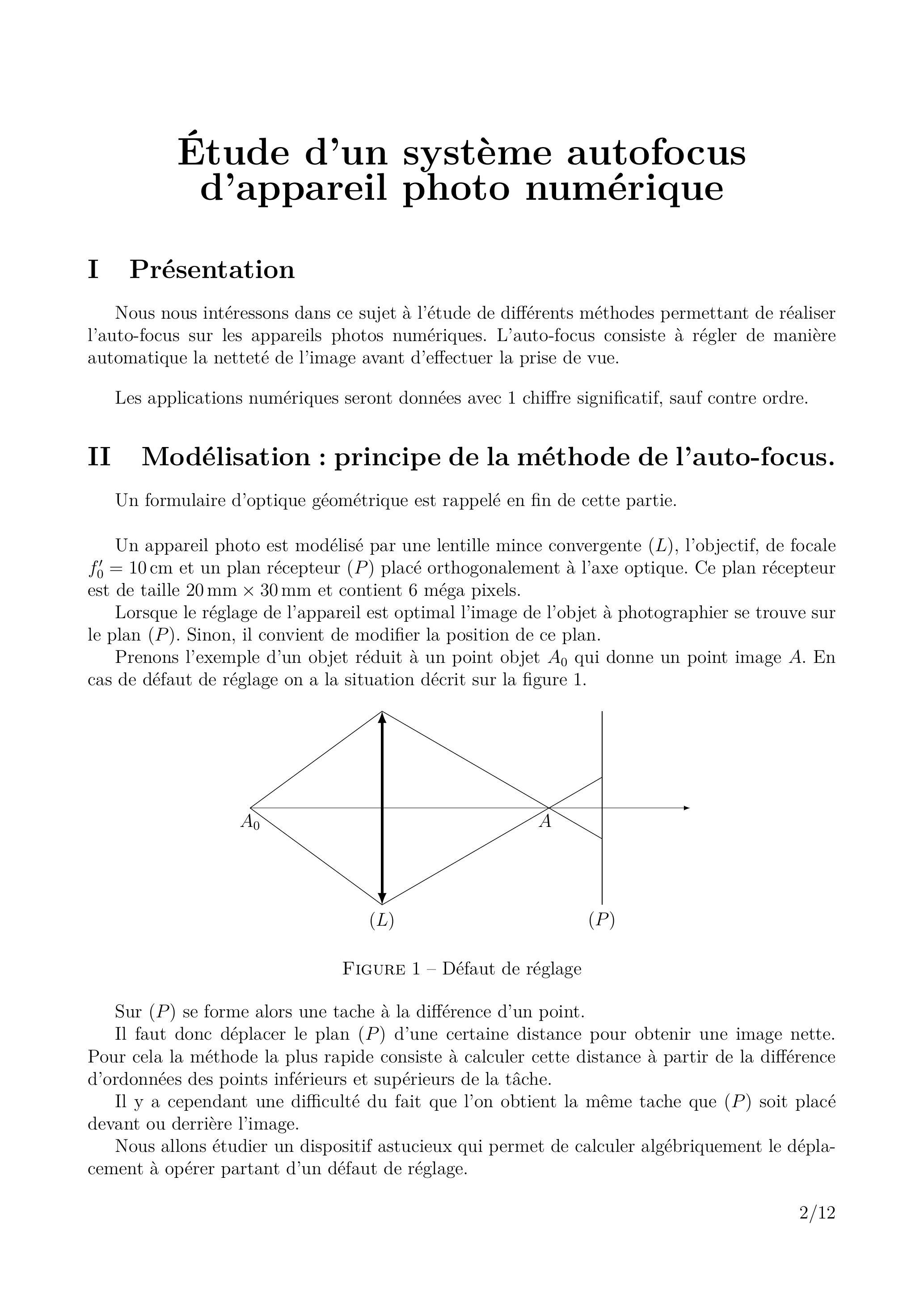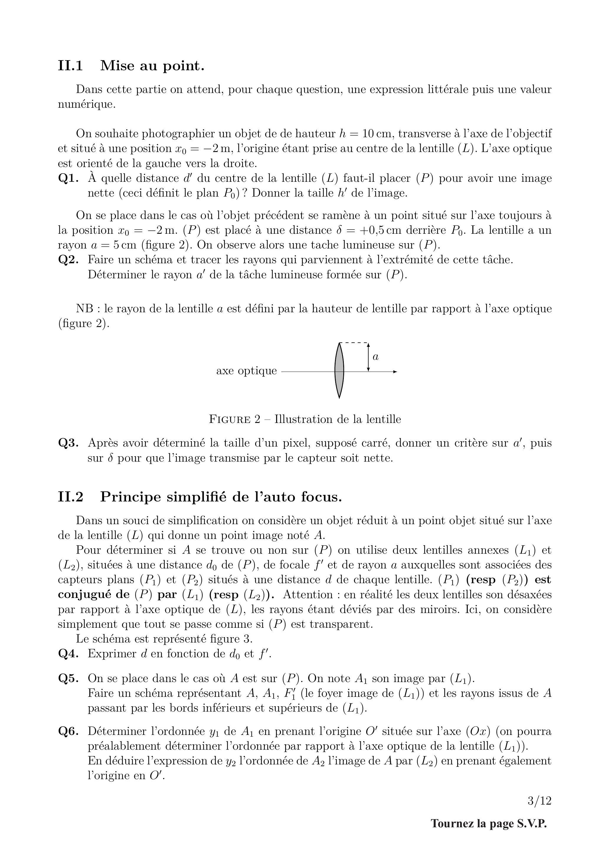 Un appareil photo est modélisé par une lentille mince convergente ( ), l'objectif, de focale et un plan récepteur ( ) placé orthogonalement à l'axe optique. Ce plan récepteur est de taille et contient 6 méga pixels.
