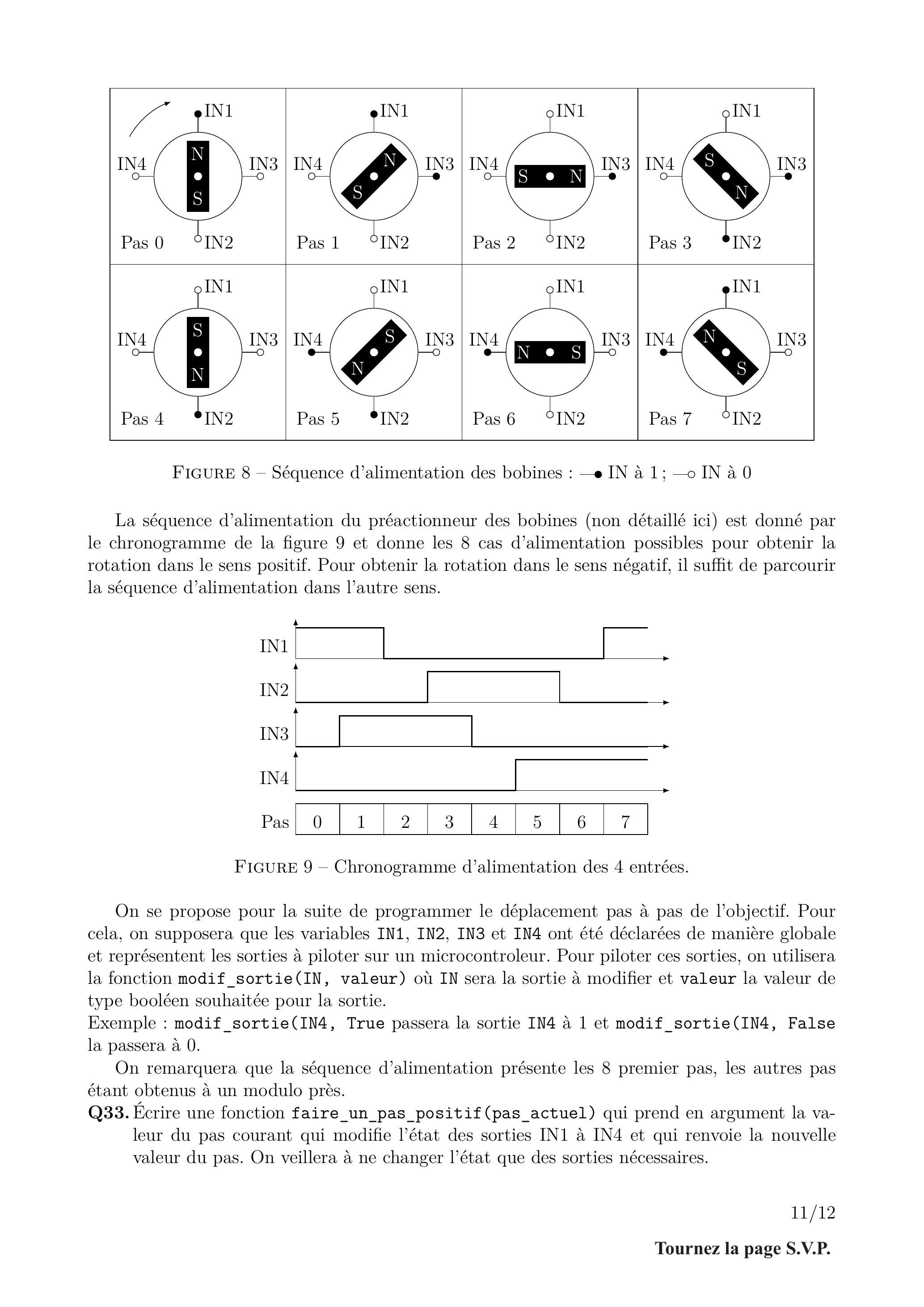 Q33. Écrire une fonction faire_un_pas_positif(pas_actuel) qui prend en argument la valeur du pas courant qui modifie l'état des sorties IN1 à IN4 et qui renvoie la nouvelle valeur du pas. On veillera à ne changer l'état que des sorties nécessaires.