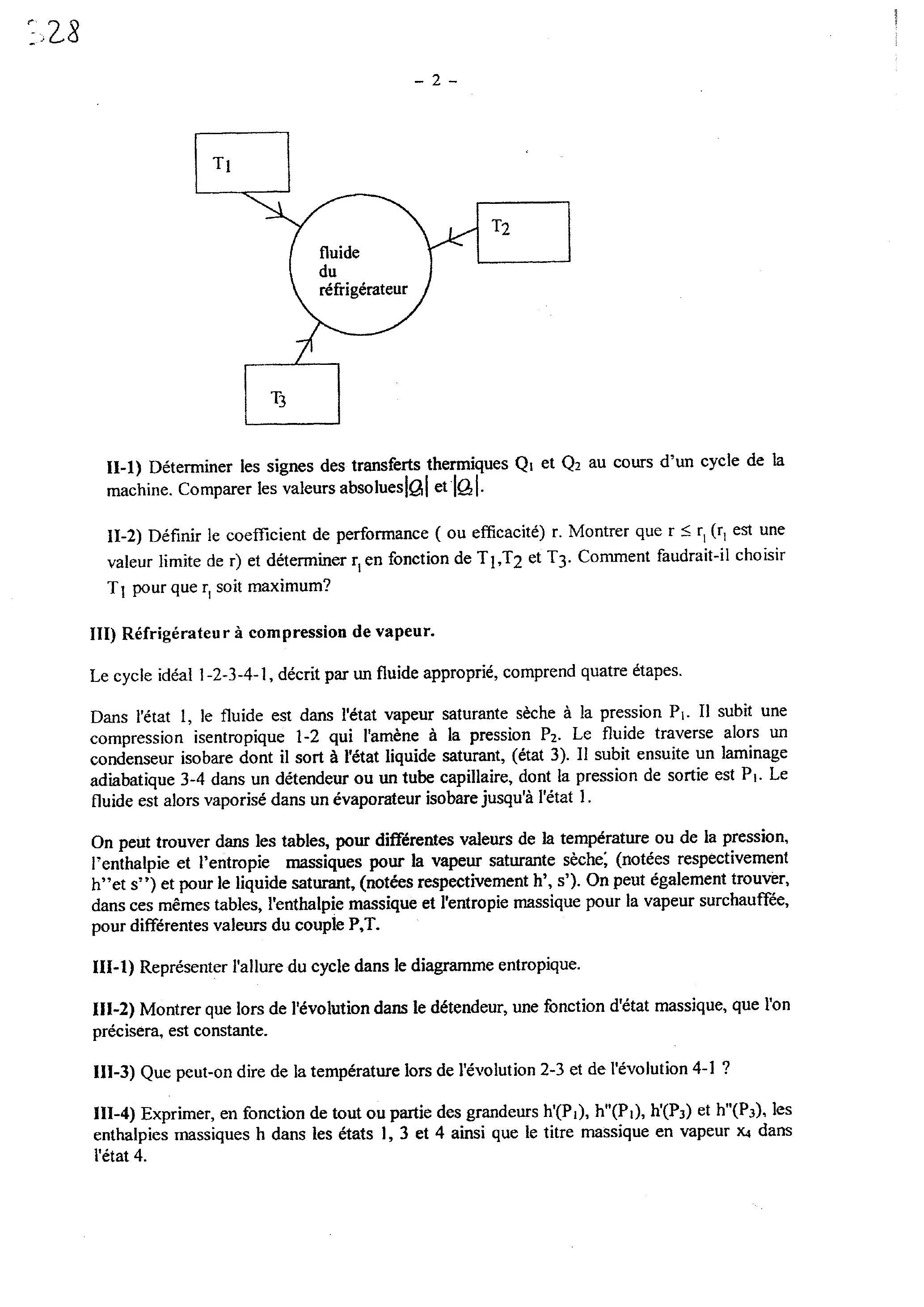 II-2) Définir le coefficient de performance ( ou efficacité) . Montrer que est une valeur limite de ) et déterminer en fonction de et . Comment faudrait-il choisir pour que soit maximum?