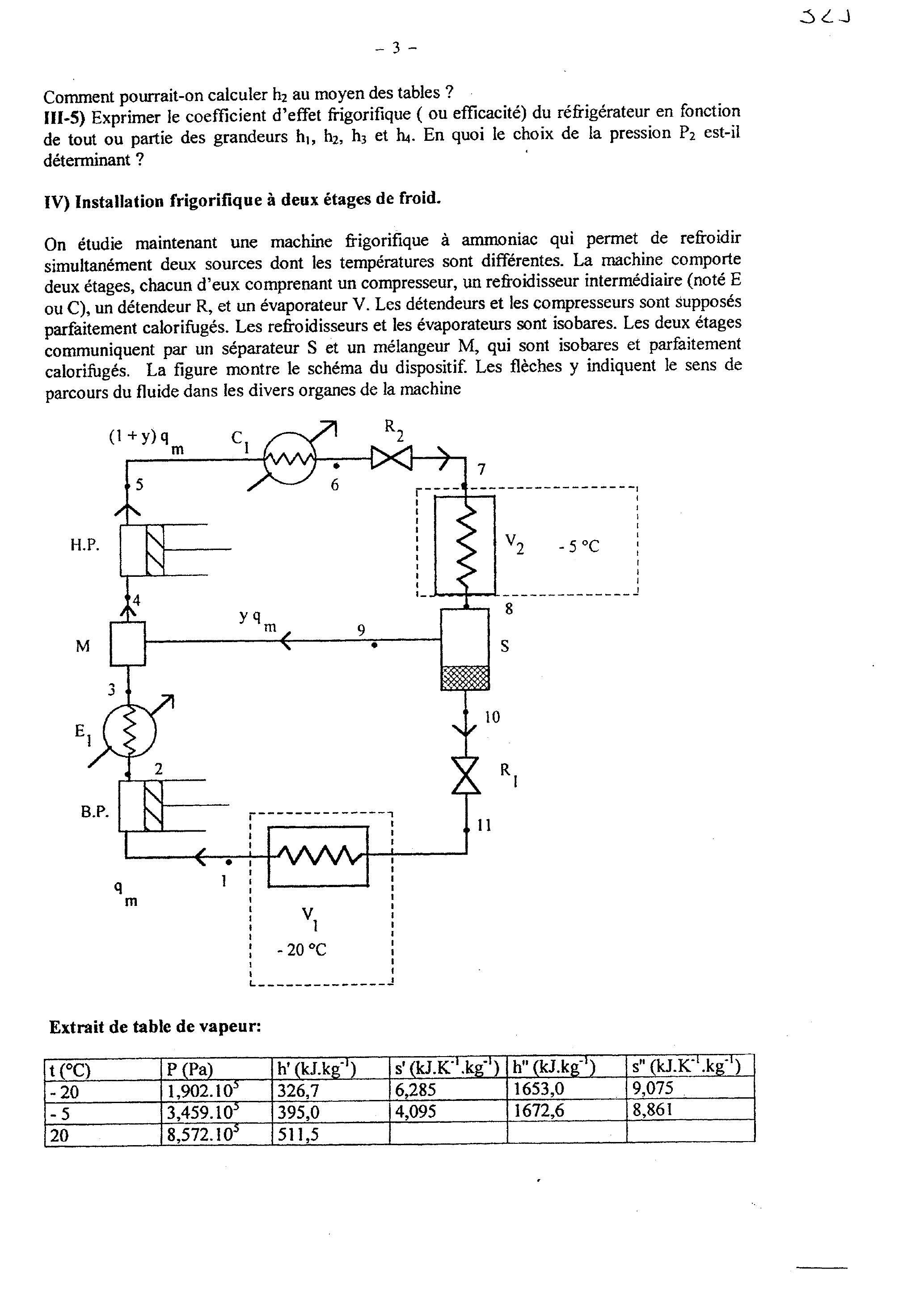 Le débit massique est égal à dans l'étage basse pression, il est égal à ( ). dans l'étage haute pression. Le premier effet frigorifique s'effectue à dans l'évaporateur , où la vaporisation est totale, le second à dans l'évaporateur , où la vaporisation est partielle. Le cahier des charges du dispositif prévoit l'absorption d'une puissance thermique à et dune puissance thermique à .