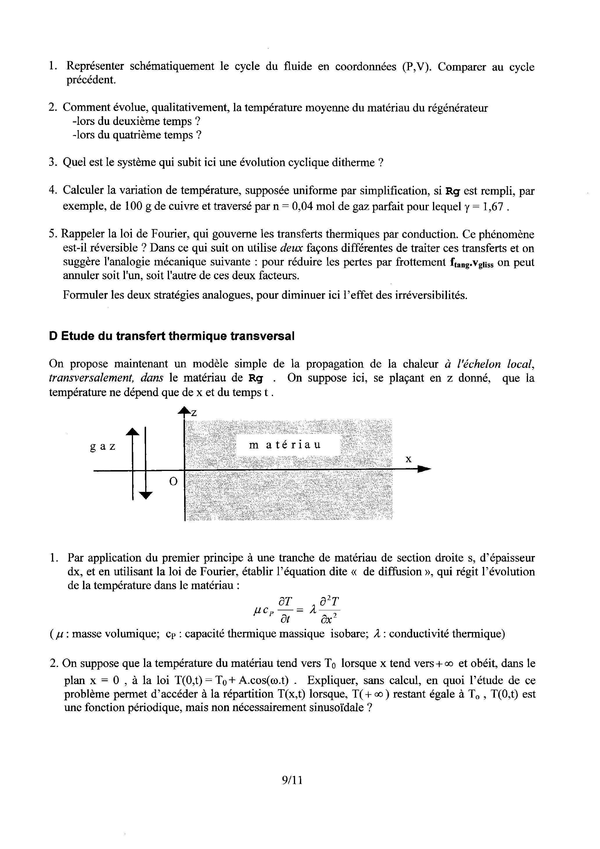 6. a. Etablir la relation donnant, à un instant t , la puissance totale P cédée, dans son transfert de à , par le gaz au matériau du régénérateur , en fonction du débit massique , de , de et de la température de sortie , pratiquement égale à près de la réversibilité.