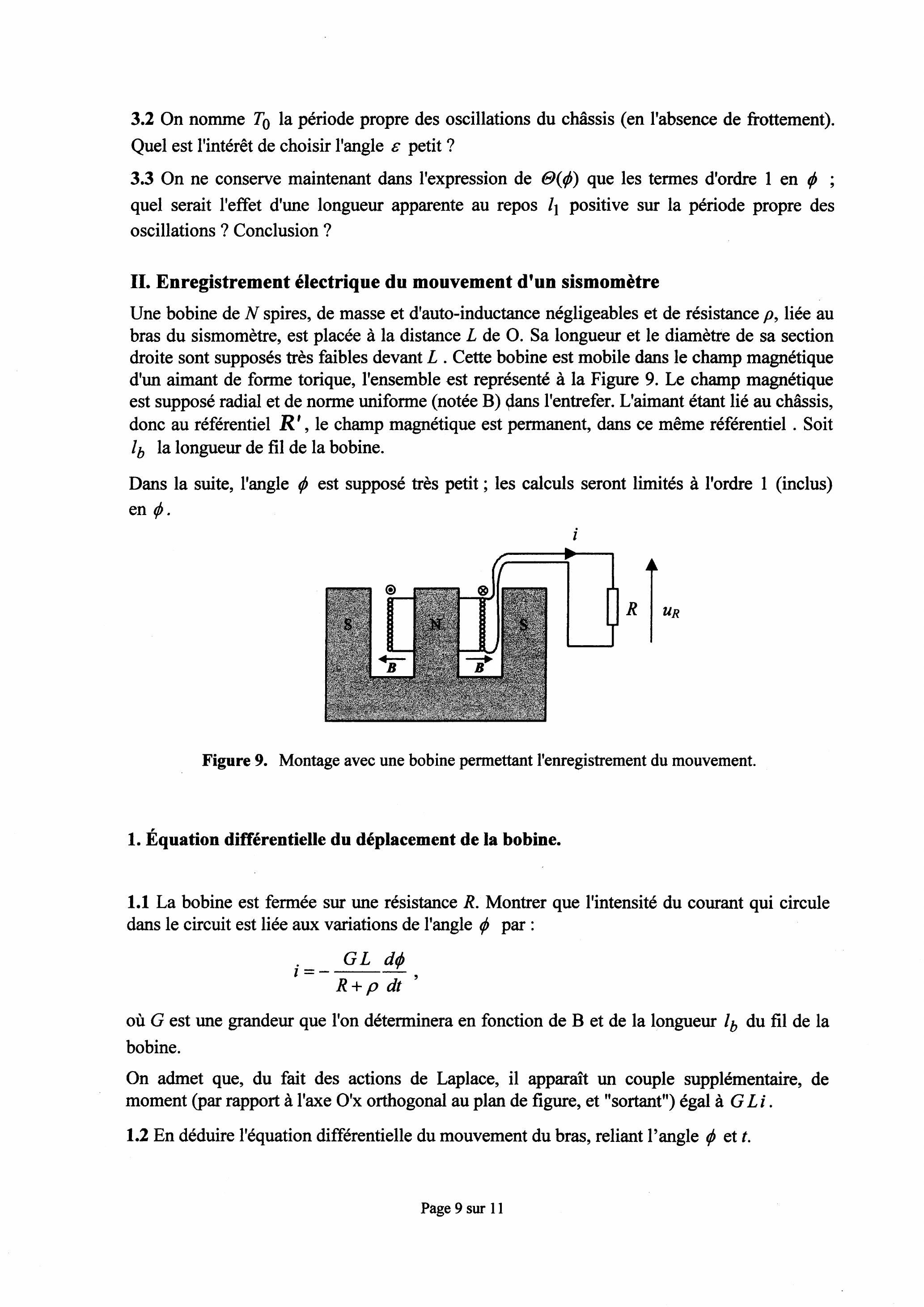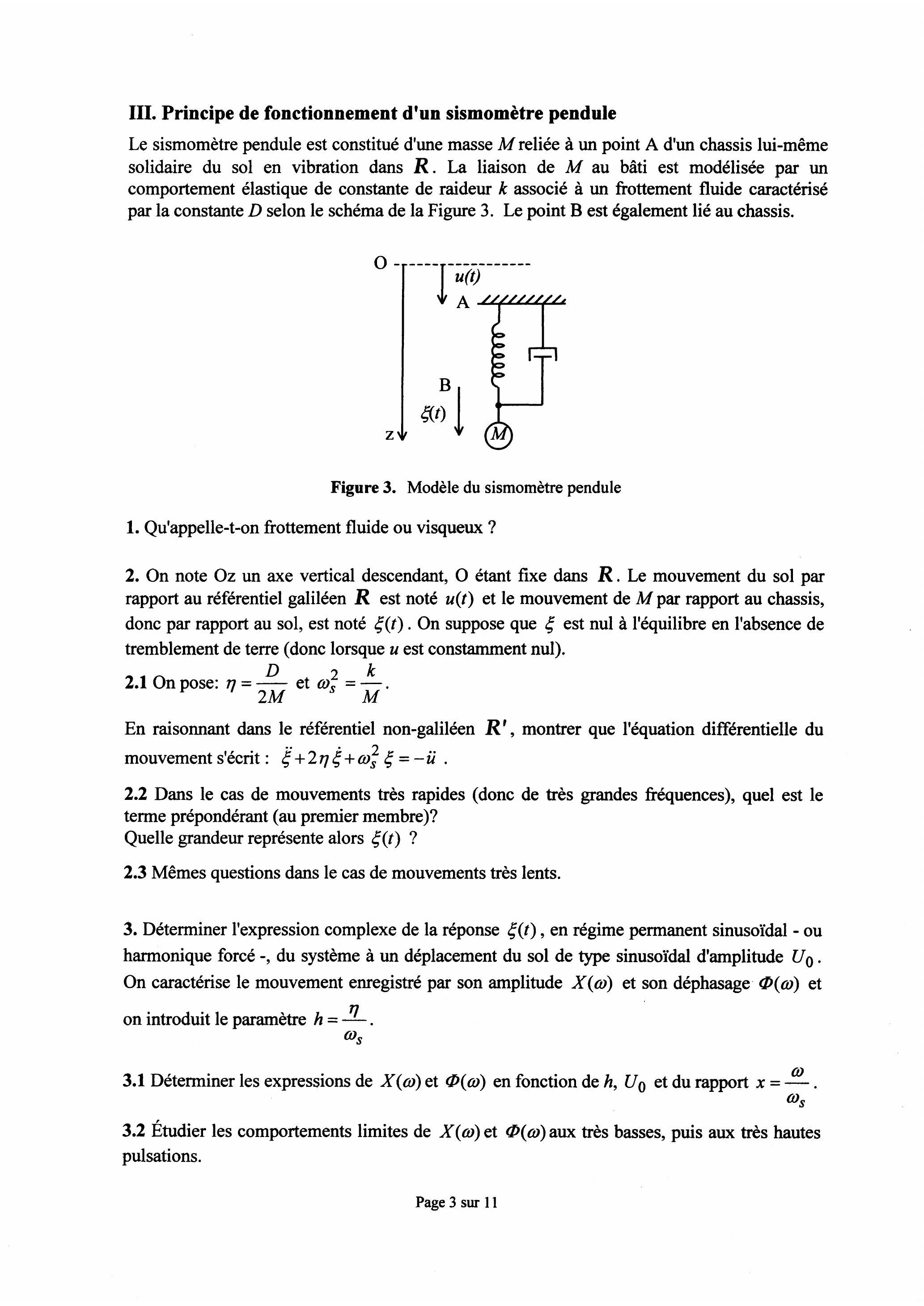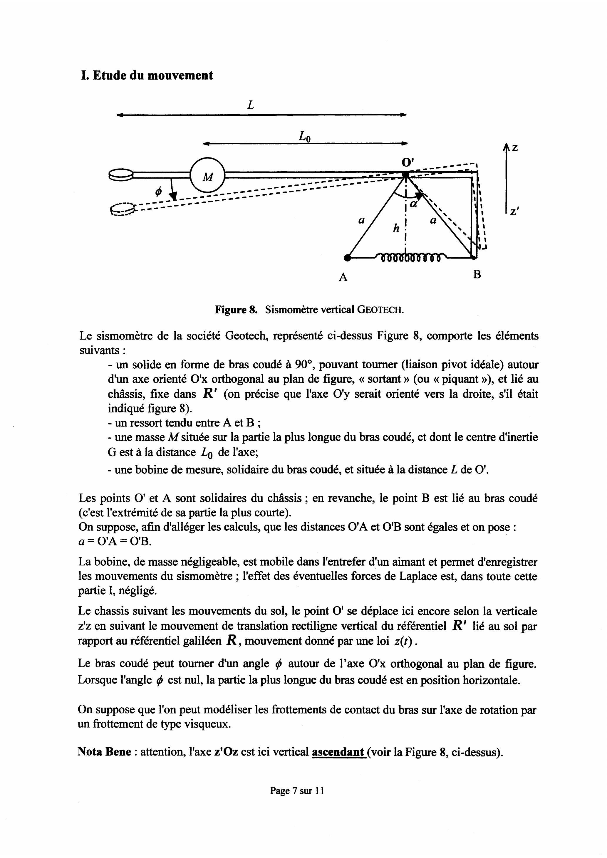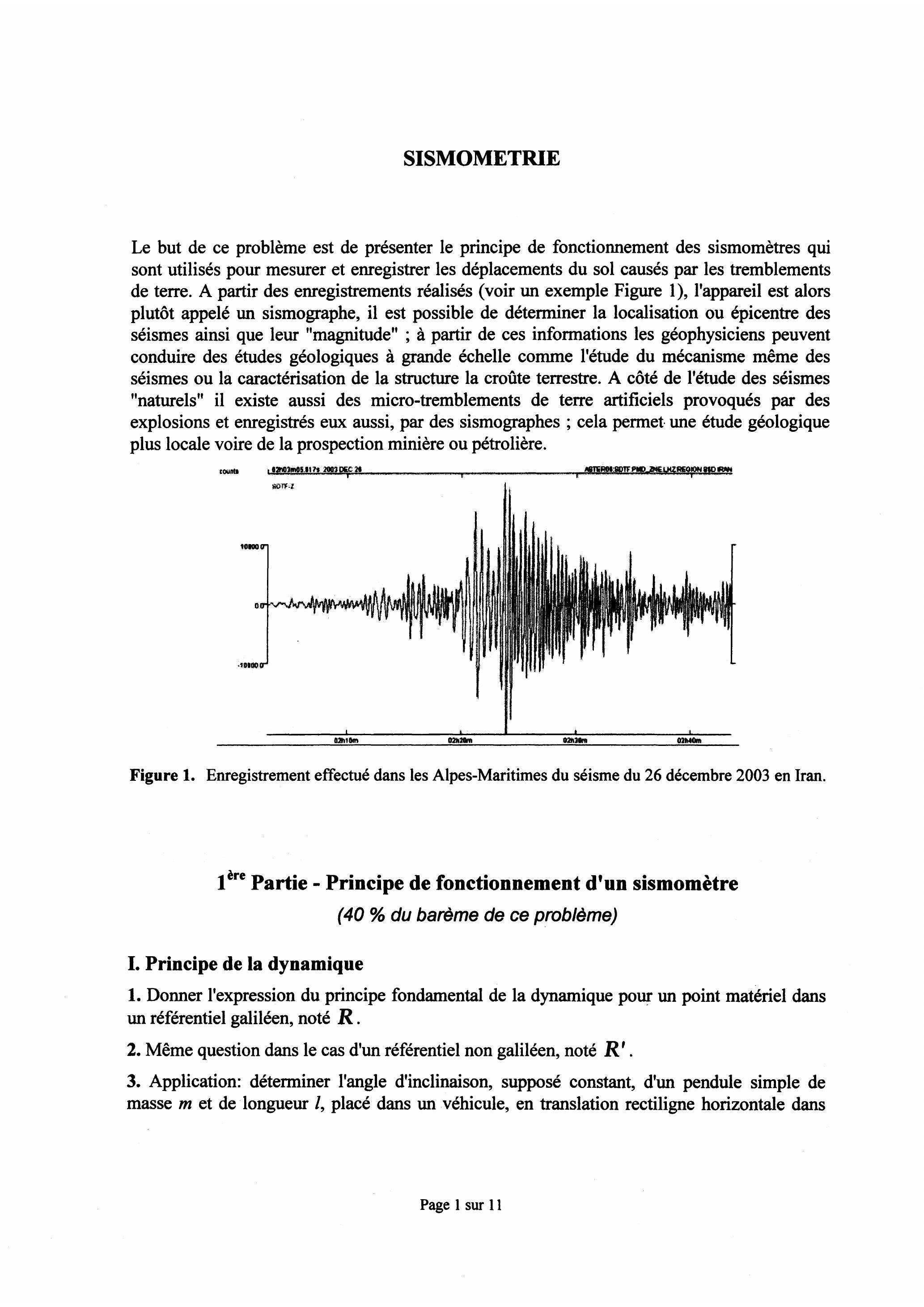Le but de ce problème est de présenter le principe de fonctionnement des sismomètres qui sont utilisés pour mesurer et enregistrer les déplacements du sol causés par les tremblements de terre. A partir des enregistrements réalisés (voir un exemple Figure 1), l'appareil est alors plutôt appelé un sismographe, il est possible de déterminer la localisation ou épicentre des séismes ainsi que leur "magnitude" ; à partir de ces informations les géophysiciens peuvent conduire des études géologiques à grande échelle comme l'étude du mécanisme même des séismes ou la caractérisation de la structure la croûte terrestre. A côté de l'étude des séismes "naturels" il existe aussi des micro-tremblements de terre artificiels provoqués par des explosions et enregistrés eux aussi, par des sismographes ; cela permet une étude géologique plus locale voire de la prospection minière ou pétrolière.