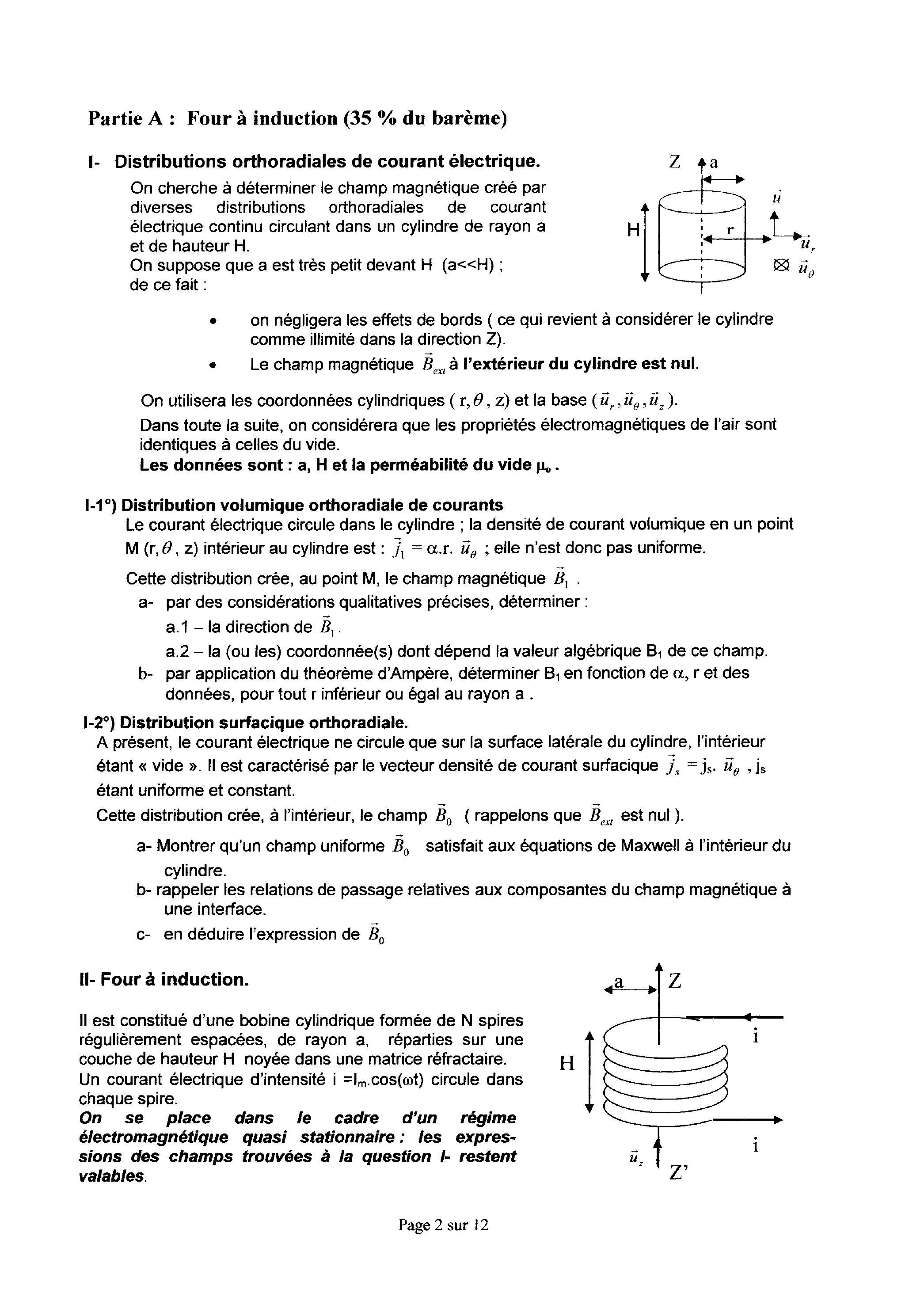On cherche à déterminer le champ magnétique créé par diverses distributions orthoradiales de courant électrique continu circulant dans un cylindre de rayon a et de hauteur H.