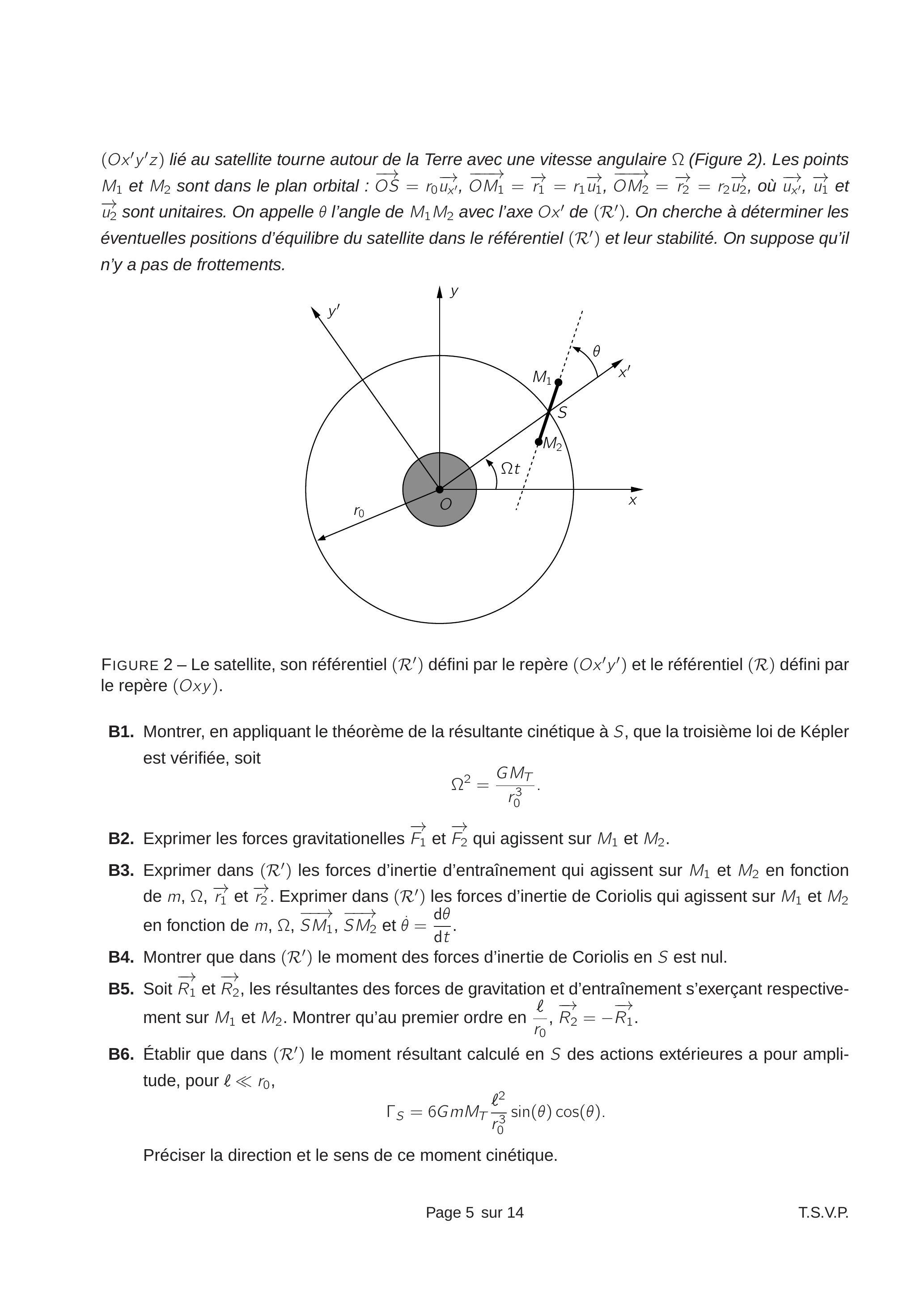 Modèle : le satellite est constitué de deux points matériels et de masses identiques reliés par une tige rigide de masse nulle et de longueur . Le barycentre du satellite décrit autour de la Terre une orbite circulaire de rayon . Le référentiel géocentrique ( ) lié au repère (Oxyz) est supposé galiléen. Le plan orbital est Oxy. Le référentiel ( ) défini par le repère