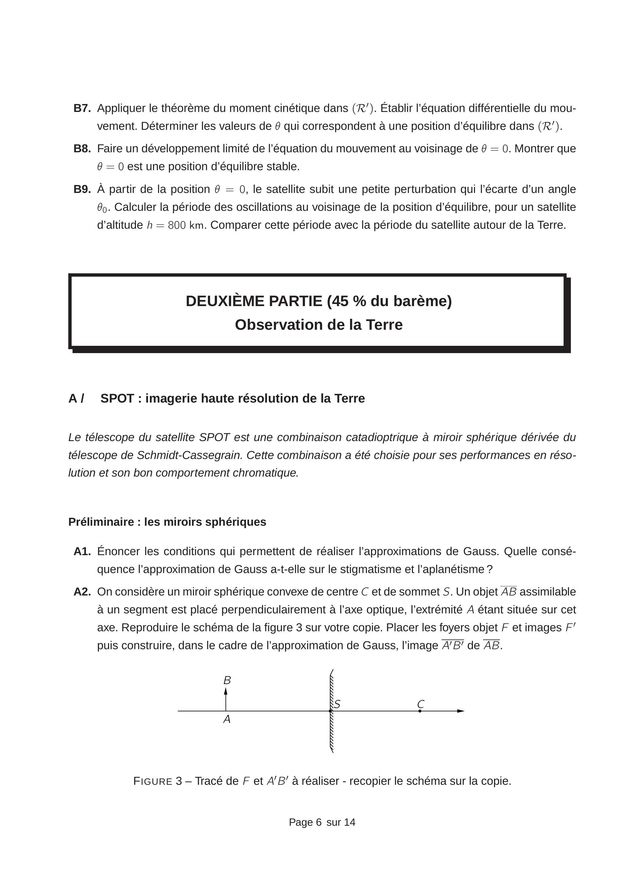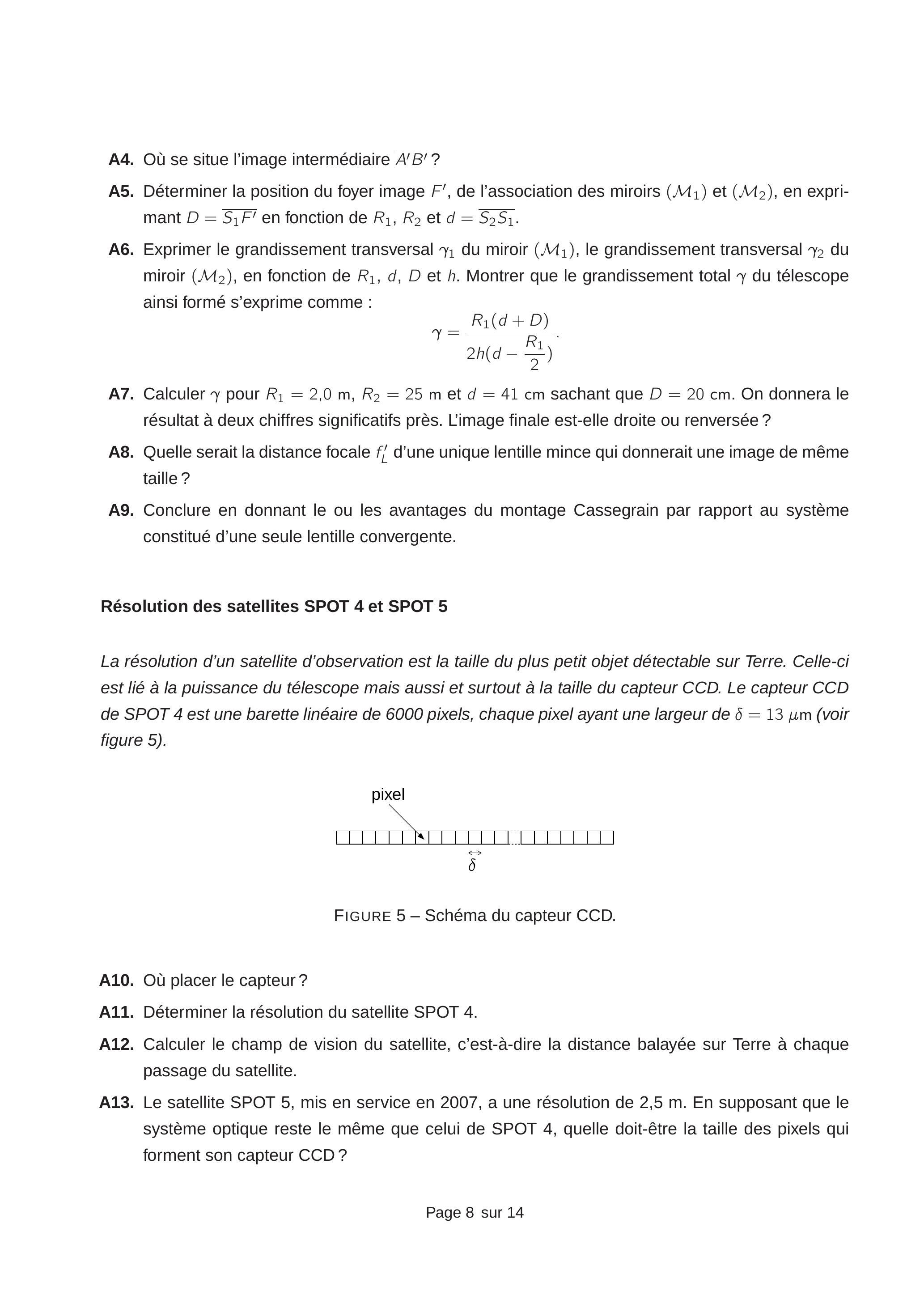 A13. Le satellite SPOT 5, mis en service en 2007, a une résolution de . En supposant que le système optique reste le même que celui de SPOT 4, quelle doit-être la taille des pixels qui forment son capteur CCD?