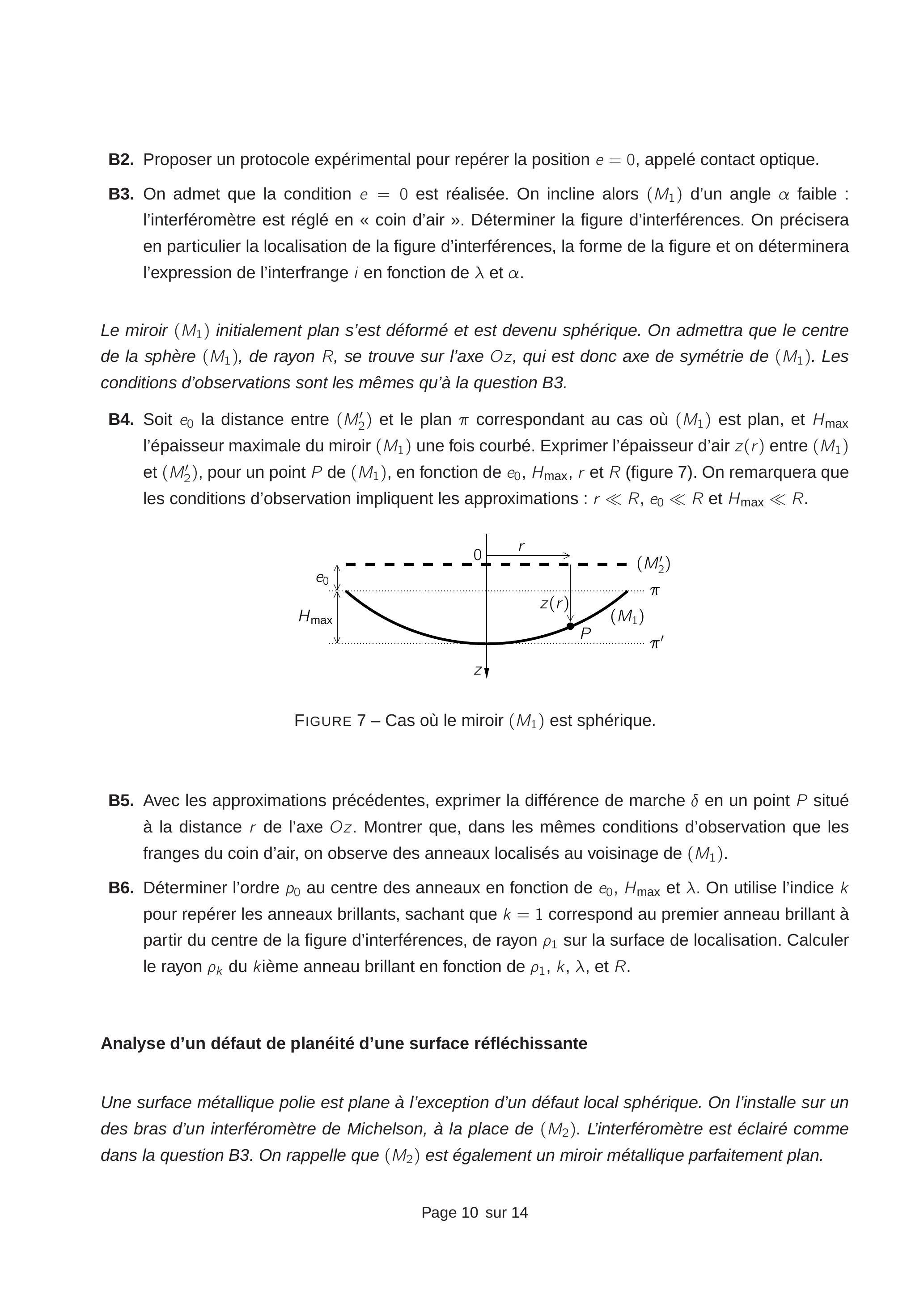 Une surface métallique polie est plane à l'exception d'un défaut local sphérique. On l'installe sur un des bras d'un interféromètre de Michelson, à la place de ( ). L'interféromètre est éclairé comme dans la question B3. On rappelle que ( ) est également un miroir métallique parfaitement plan.