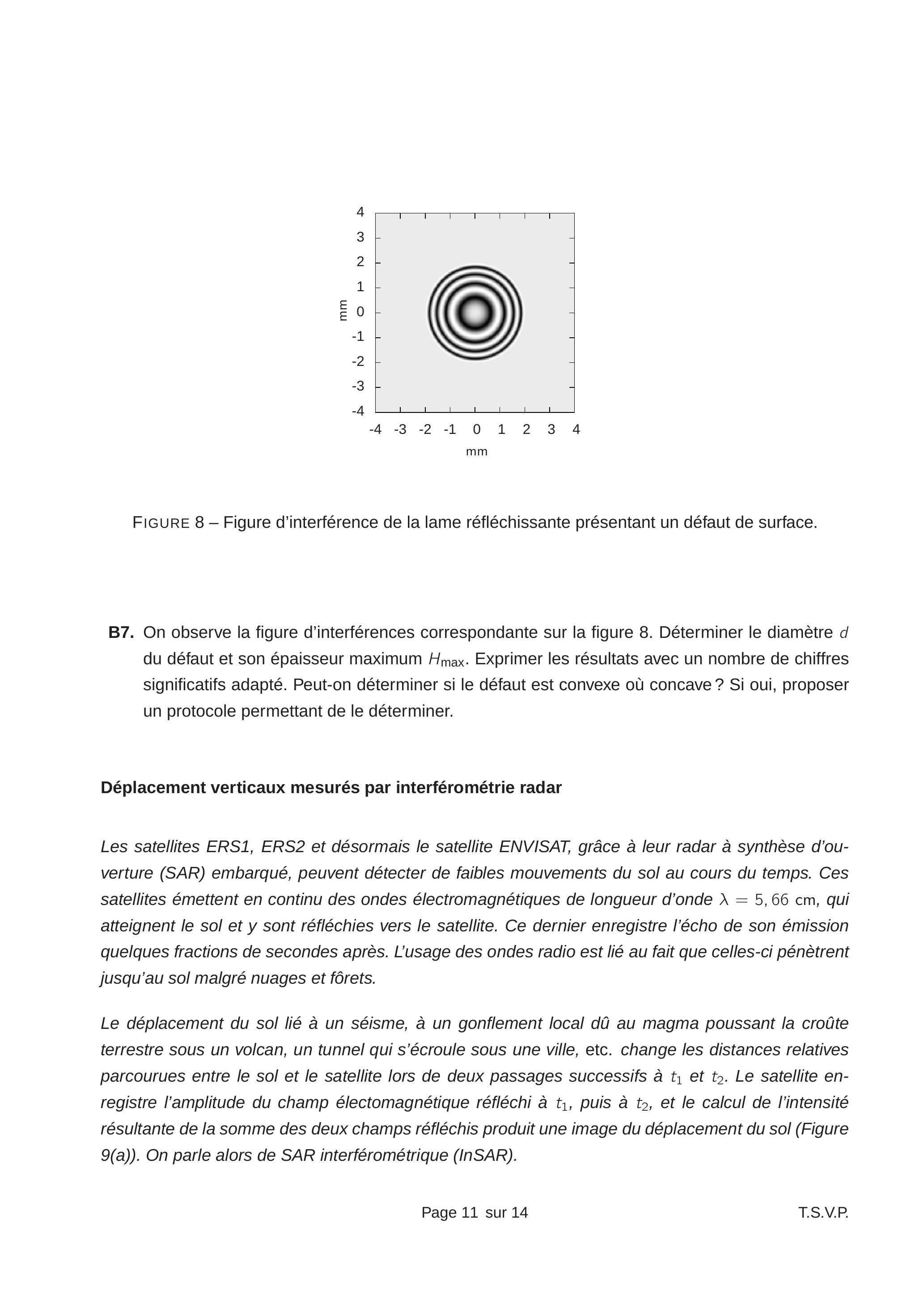 B7. On observe la figure d'interférences correspondante sur la figure 8. Déterminer le diamètre du défaut et son épaisseur maximum . Exprimer les résultats avec un nombre de chiffres significatifs adapté. Peut-on déterminer si le défaut est convexe où concave? Si oui, proposer un protocole permettant de le déterminer.