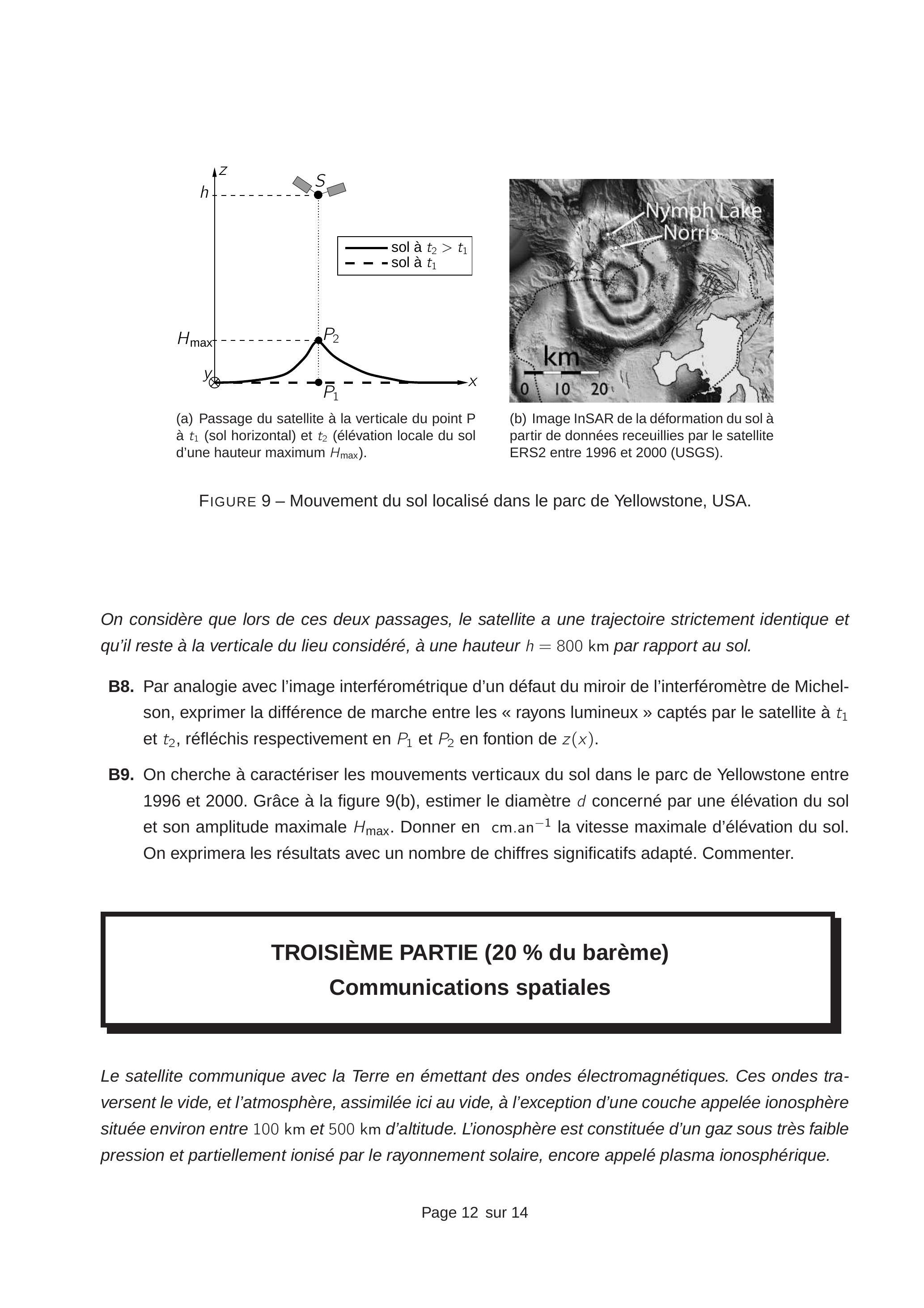 B9. On cherche à caractériser les mouvements verticaux du sol dans le parc de Yellowstone entre 1996 et 2000. Grâce à la figure 9(b), estimer le diamètre concerné par une élévation du sol et son amplitude maximale . Donner en la vitesse maximale d'élévation du sol. On exprimera les résultats avec un nombre de chiffres significatifs adapté. Commenter.