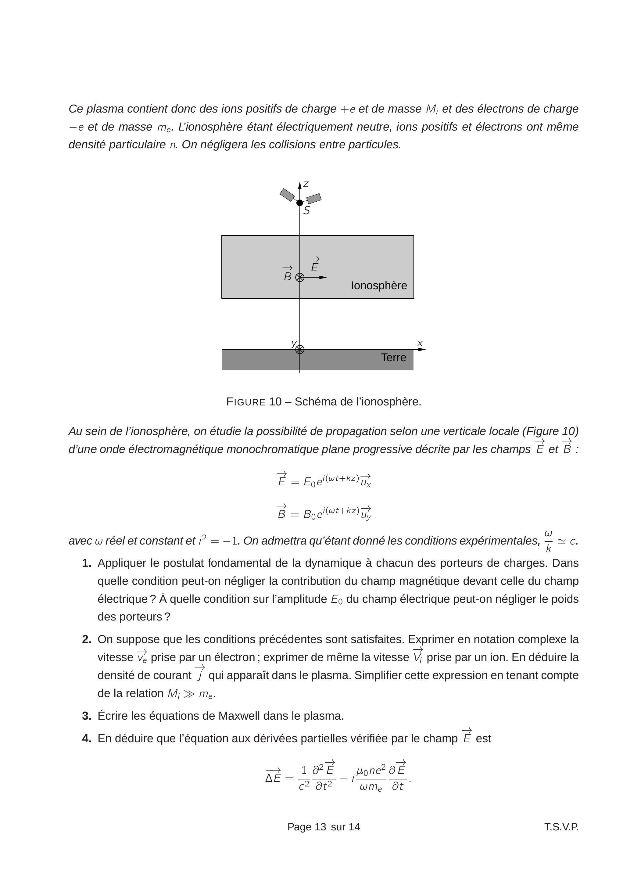 Ce plasma contient donc des ions positifs de charge et de masse et des électrons de charge -e et de masse . L'ionosphère étant électriquement neutre, ions positifs et électrons ont même densité particulaire n. On négligera les collisions entre particules.
