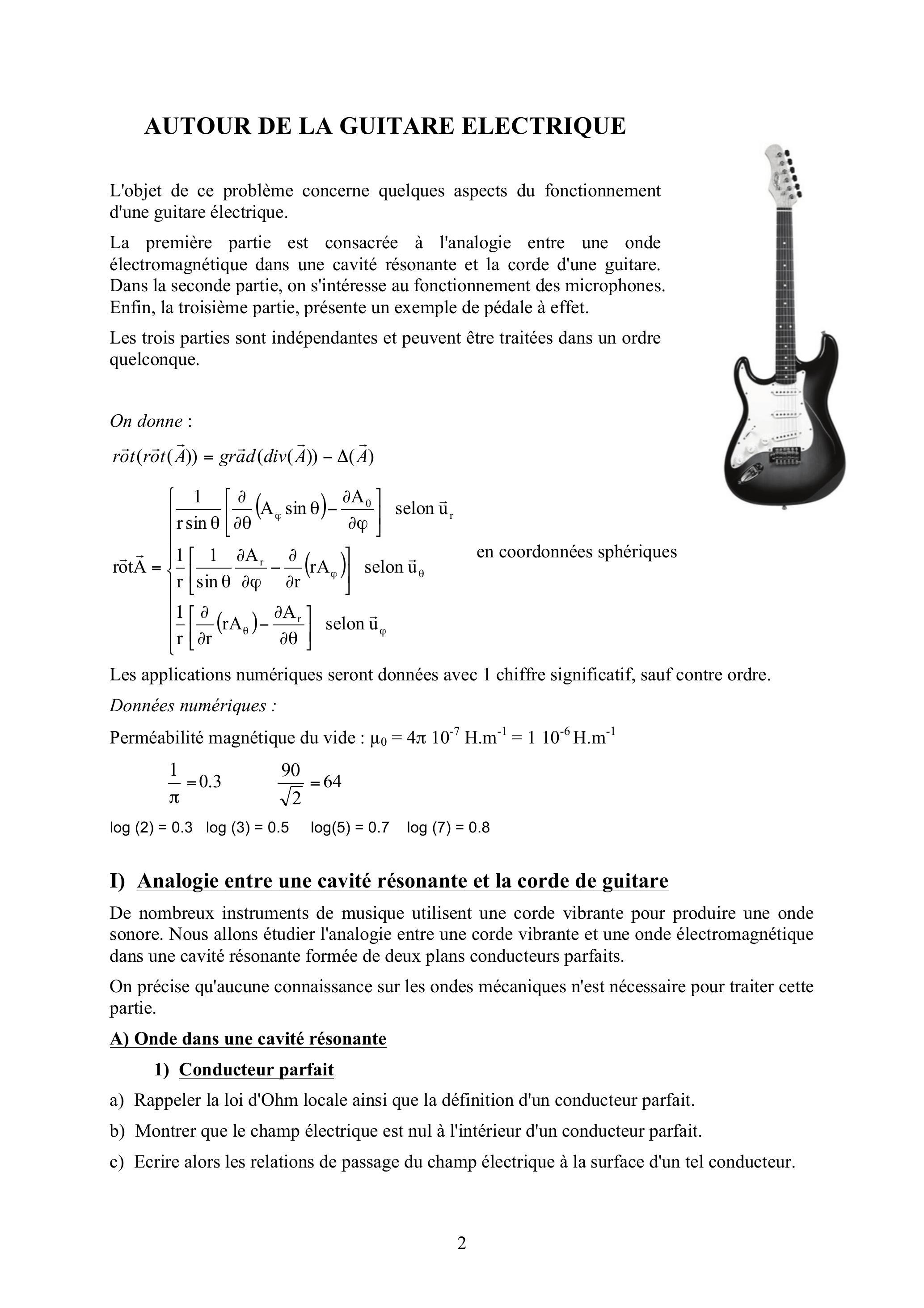 La première partie est consacrée à l'analogie entre une onde électromagnétique dans une cavité résonante et la corde d'une guitare. Dans la seconde partie, on s'intéresse au fonctionnement des microphones. Enfin, la troisième partie, présente un exemple de pédale à effet.