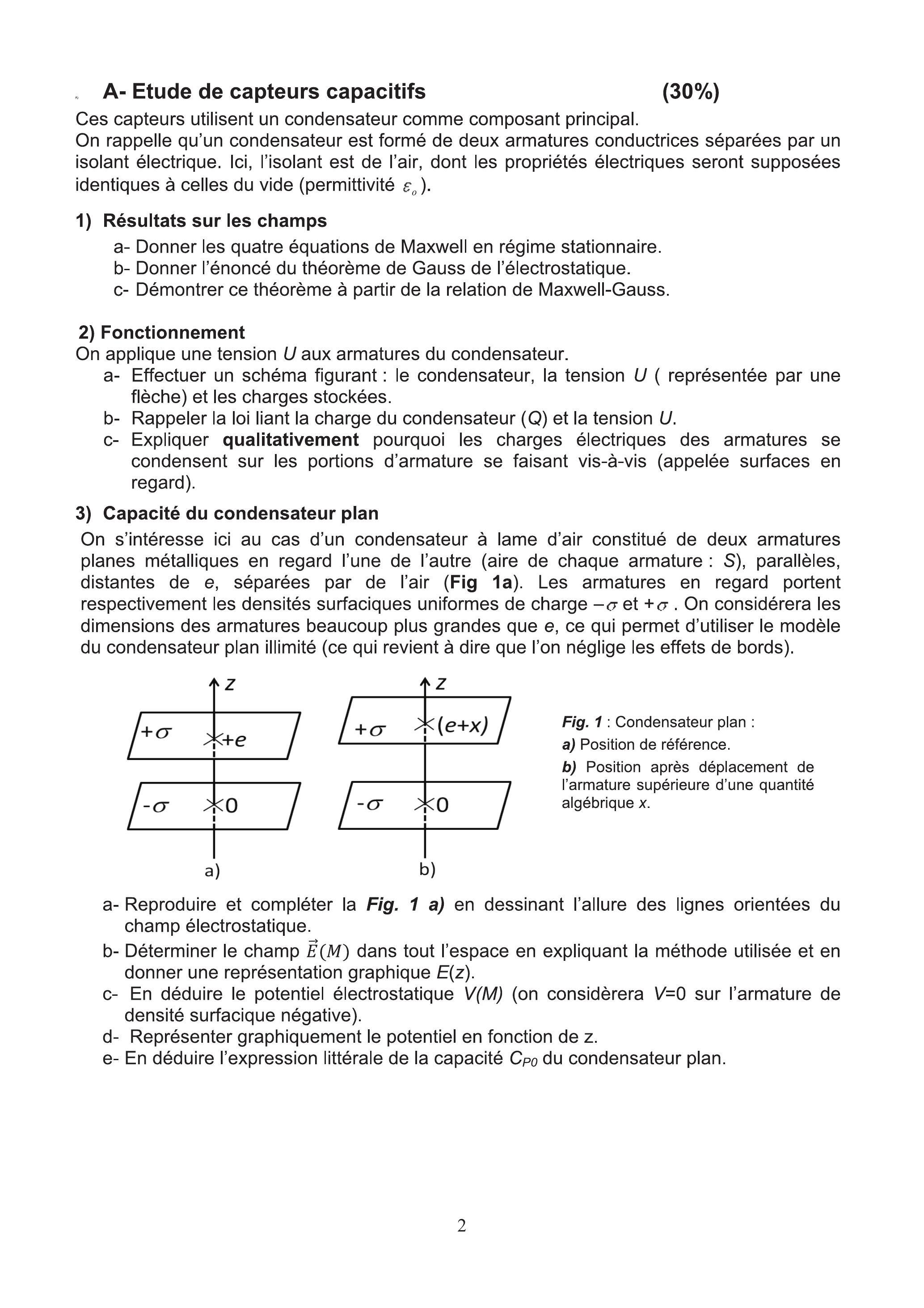 On s'intéresse ici au cas d'un condensateur à lame d'air constitué de deux armatures planes métalliques en regard l'une de l'autre (aire de chaque armature: ), parallèles, distantes de e, séparées par de l'air (Fig 1a). Les armatures en regard portent respectivement les densités surfaciques uniformes de charge et . On considérera les dimensions des armatures beaucoup plus grandes que , ce qui permet d'utiliser le modèle du condensateur plan illimité (ce qui revient à dire que l'on néglige les effets de bords).