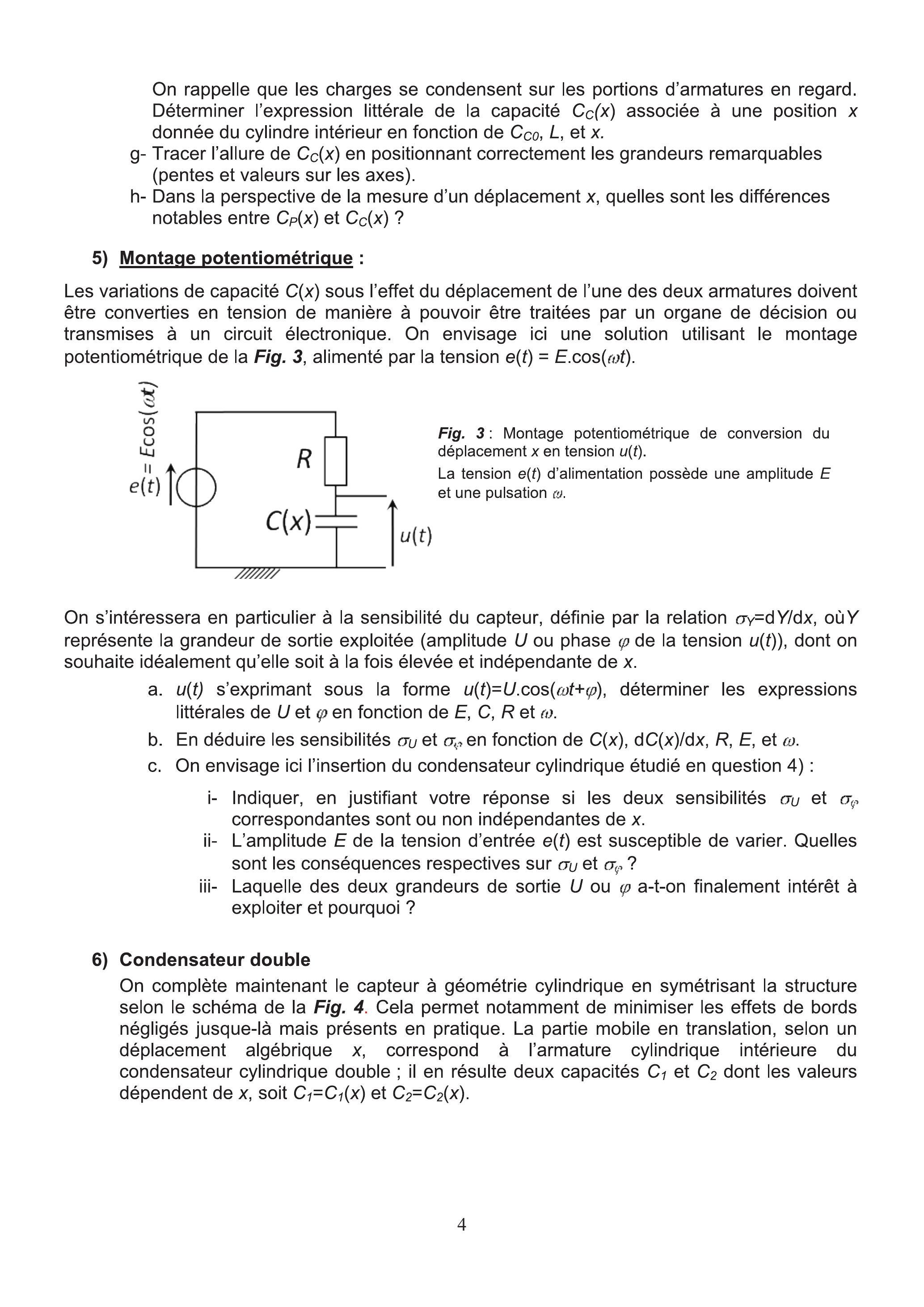Les variations de capacité sous l'effet du déplacement de l'une des deux armatures doivent être converties en tension de manière à pouvoir être traitées par un organe de décision ou transmises à un circuit électronique. On envisage ici une solution utilisant le montage potentiométrique de la Fig. 3, alimenté par la tension .