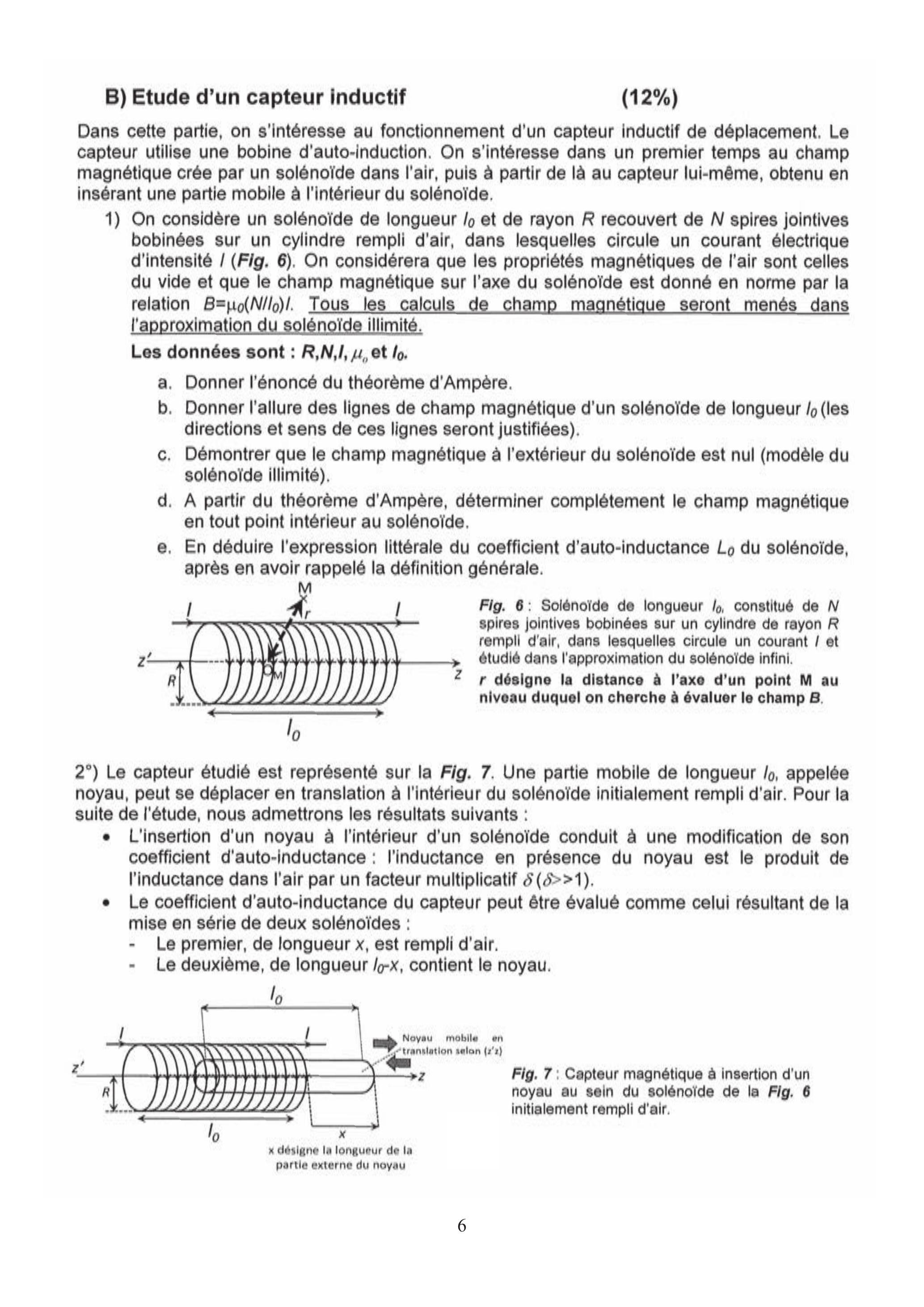 On considère un solénoïde de longueur et de rayon recouvert de spires jointives bobinées sur un cylindre rempli d'air, dans lesquelles circule un courant électrique d'intensité / (Fig. 6). On considérera que les propriétés magnétiques de l'air sont celles du vide et que le champ magnétique sur l'axe du solénoìde est donné en norme par la relation . Tous les calculs de champ magnétique seront menés dans l'approximation du solénoǐde illimité.