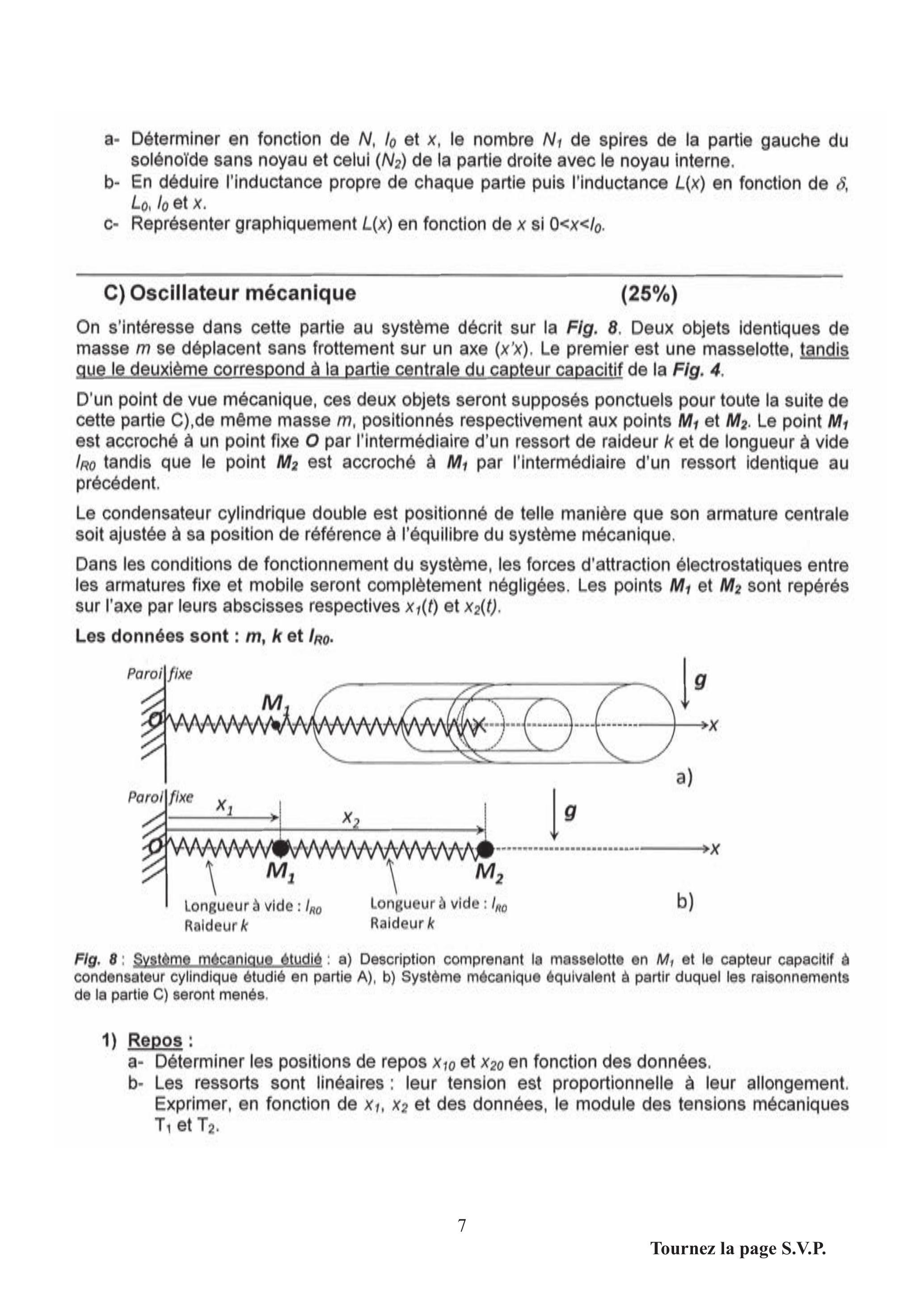 D'un point de vue mécanique, ces deux objets seront supposés ponctuels pour toute la suite de cette partie C), de même masse positionnés respectivement aux points et . Le point est accroché à un point fixe par l'intermédiaire d'un ressort de raideur et de longueur à vide tandis que le point est accroché à par l'intermédiaire d'un ressort identique au précédent.