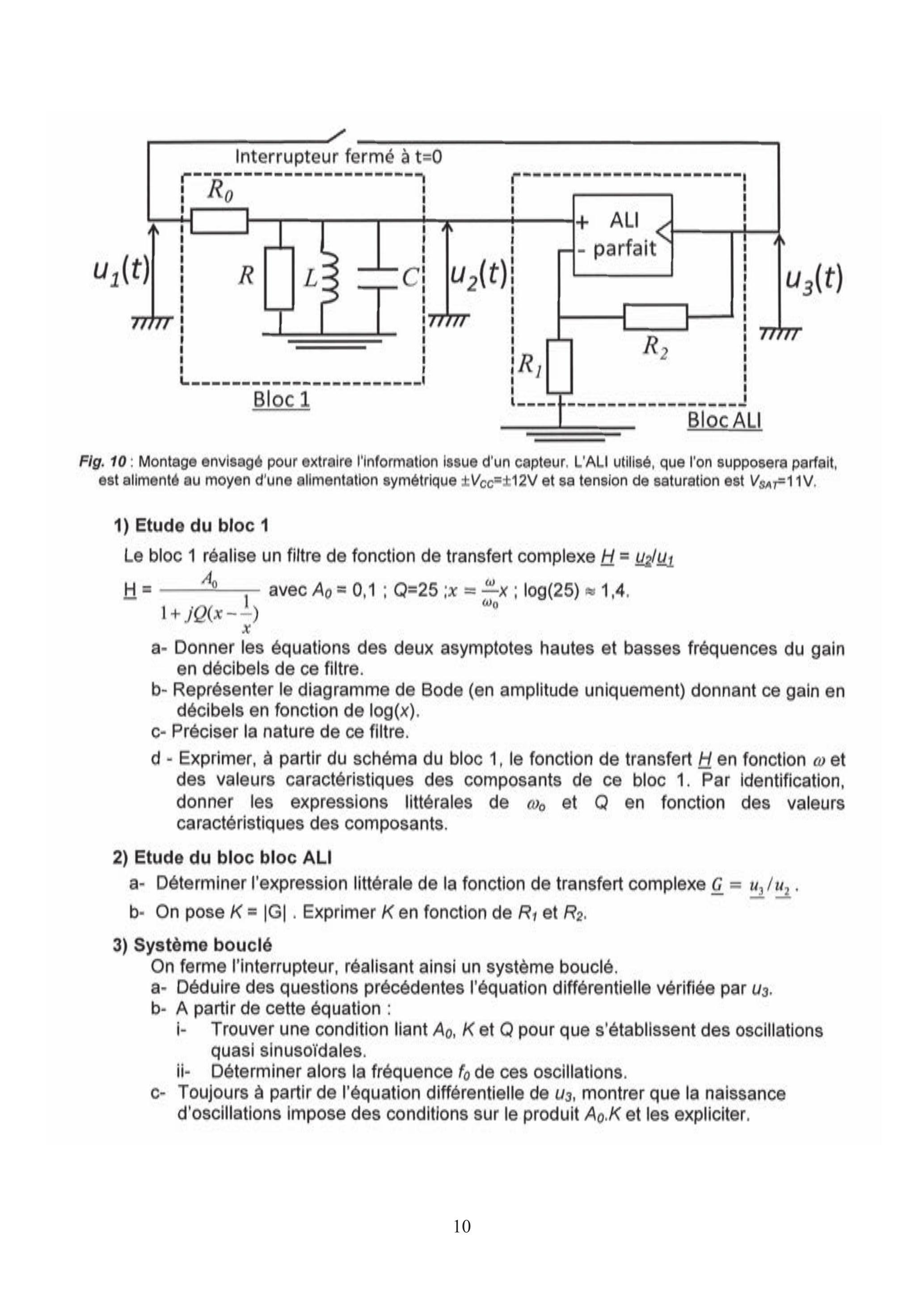 5) On utilise le dispositif complet pour suivre les déplacements de la partie mobile d'un capteur capacitif dont la capacité est donnée par la loi , avec et /=10 mm. Ce capteur forme le condensateur du bloc 1 de la Fig. 10.