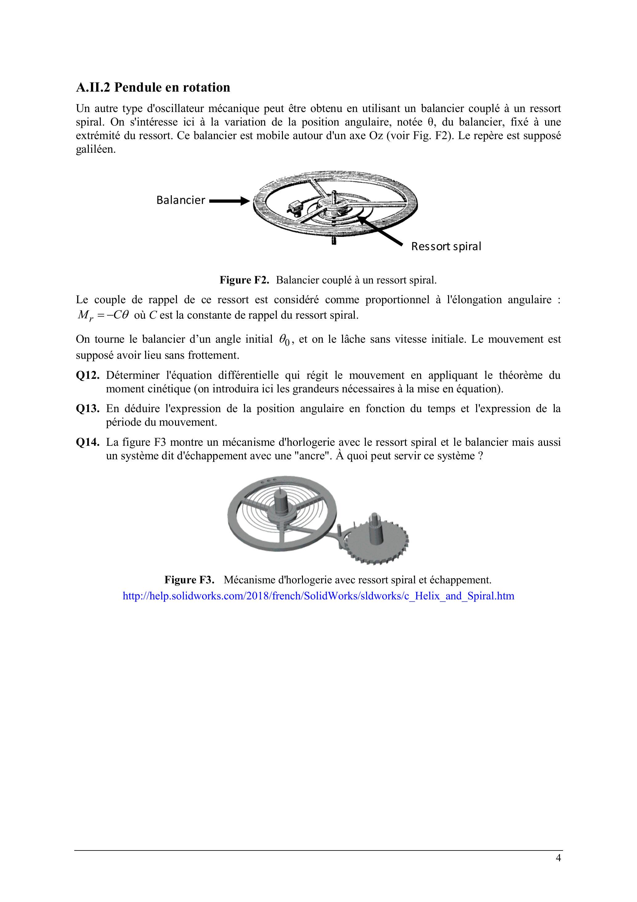 Un autre type d'oscillateur mécanique peut être obtenu en utilisant un balancier couplé à un ressort spiral. On s'intéresse ici à la variation de la position angulaire, notée , du balancier, fixé à une extrémité du ressort. Ce balancier est mobile autour d'un axe Oz (voir Fig. F2). Le repère est supposé galiléen.