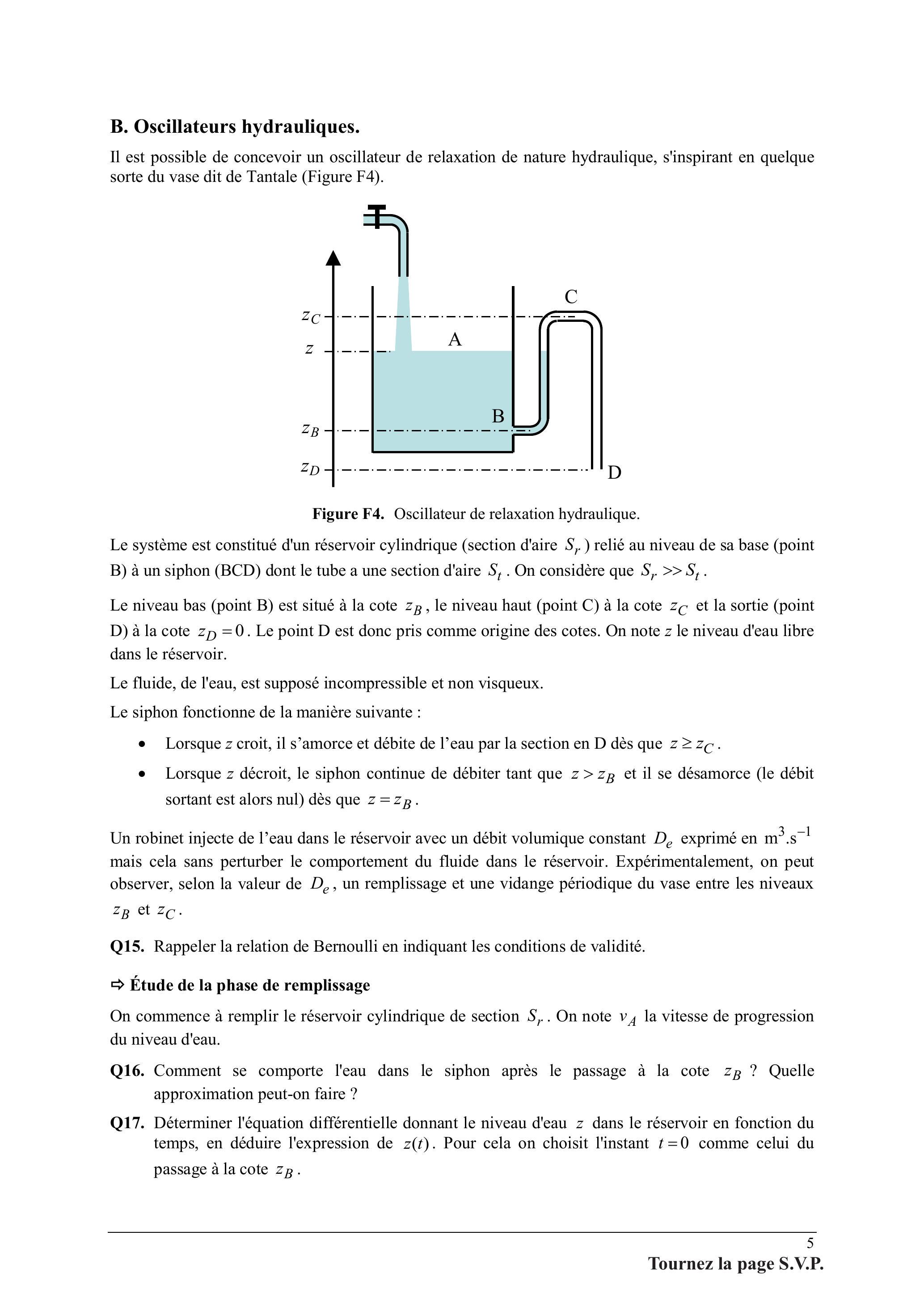 Le système est constitué d'un réservoir cylindrique (section d'aire ) relié au niveau de sa base (point B) à un siphon (BCD) dont le tube a une section d'aire . On considère que .