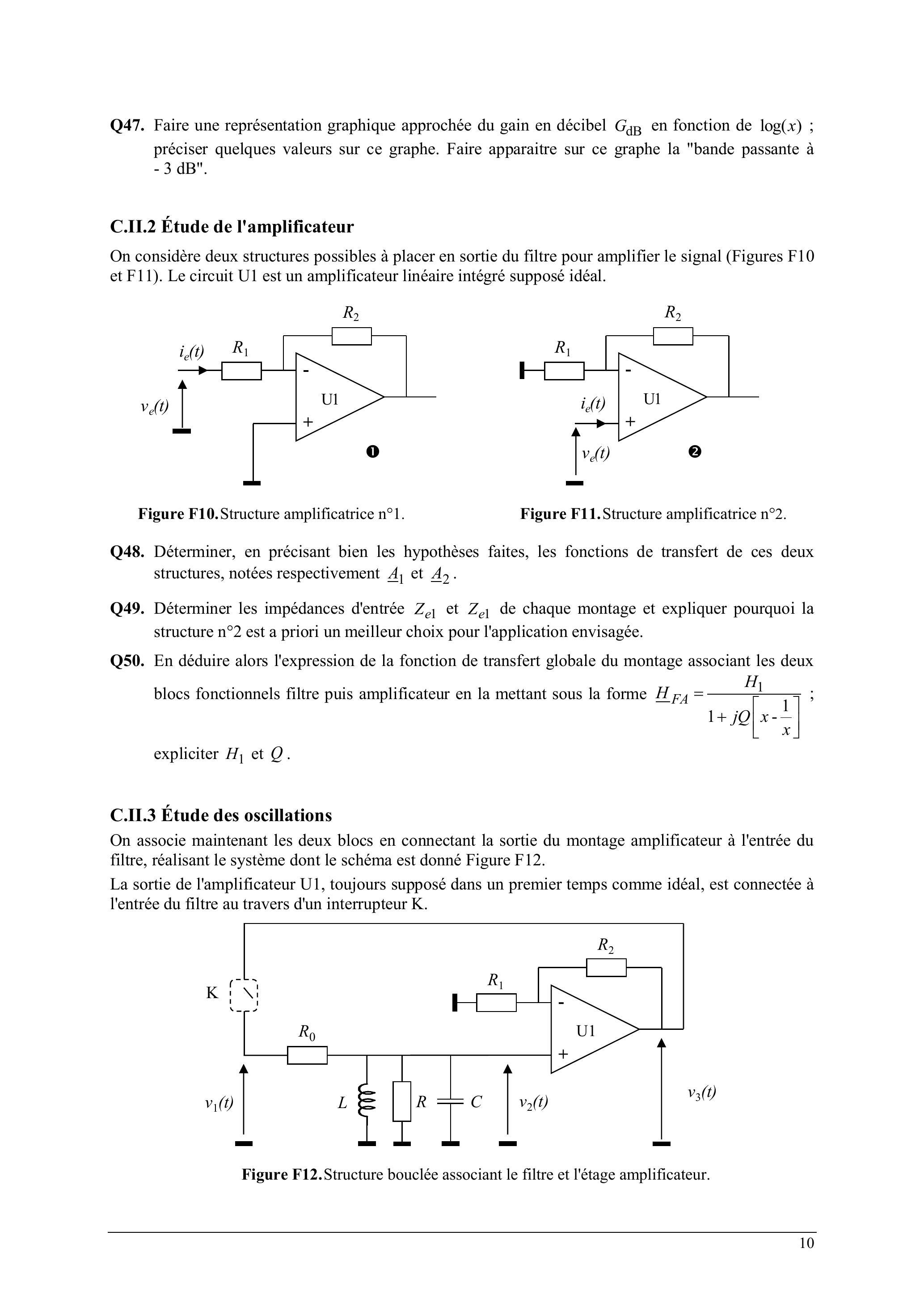 On considère deux structures possibles à placer en sortie du filtre pour amplifier le signal (Figures F10 et F11). Le circuit U1 est un amplificateur linéaire intégré supposé idéal.