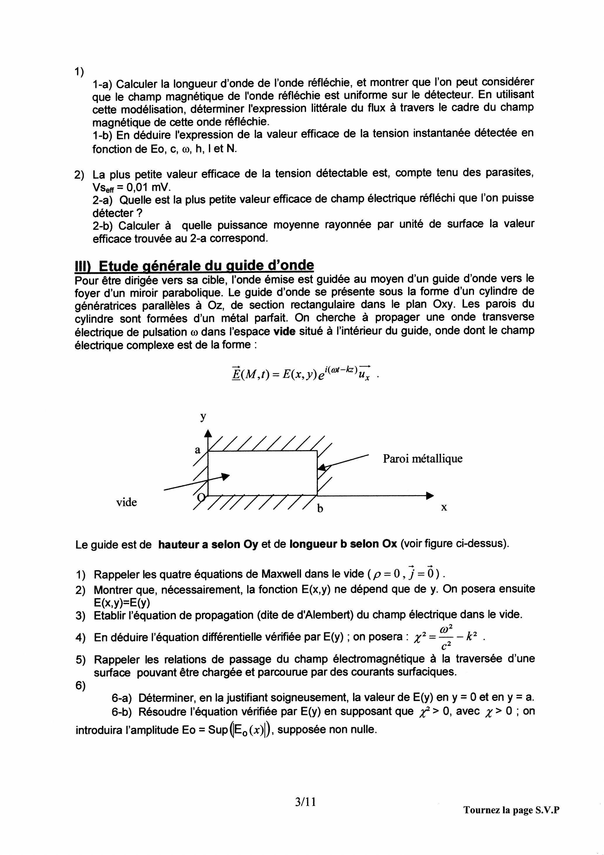 Pour être dirigée vers sa cible, l'onde émise est guidée au moyen d'un guide d'onde vers le foyer d'un miroir parabolique. Le guide d'onde se présente sous la forme d'un cylindre de génératrices parallèles à Oz , de section rectangulaire dans le plan Oxy. Les parois du cylindre sont formées d'un métal parfait. On cherche à propager une onde transverse électrique de pulsation dans l'espace vide situé à l'intérieur du guide, onde dont le champ électrique complexe est de la forme :