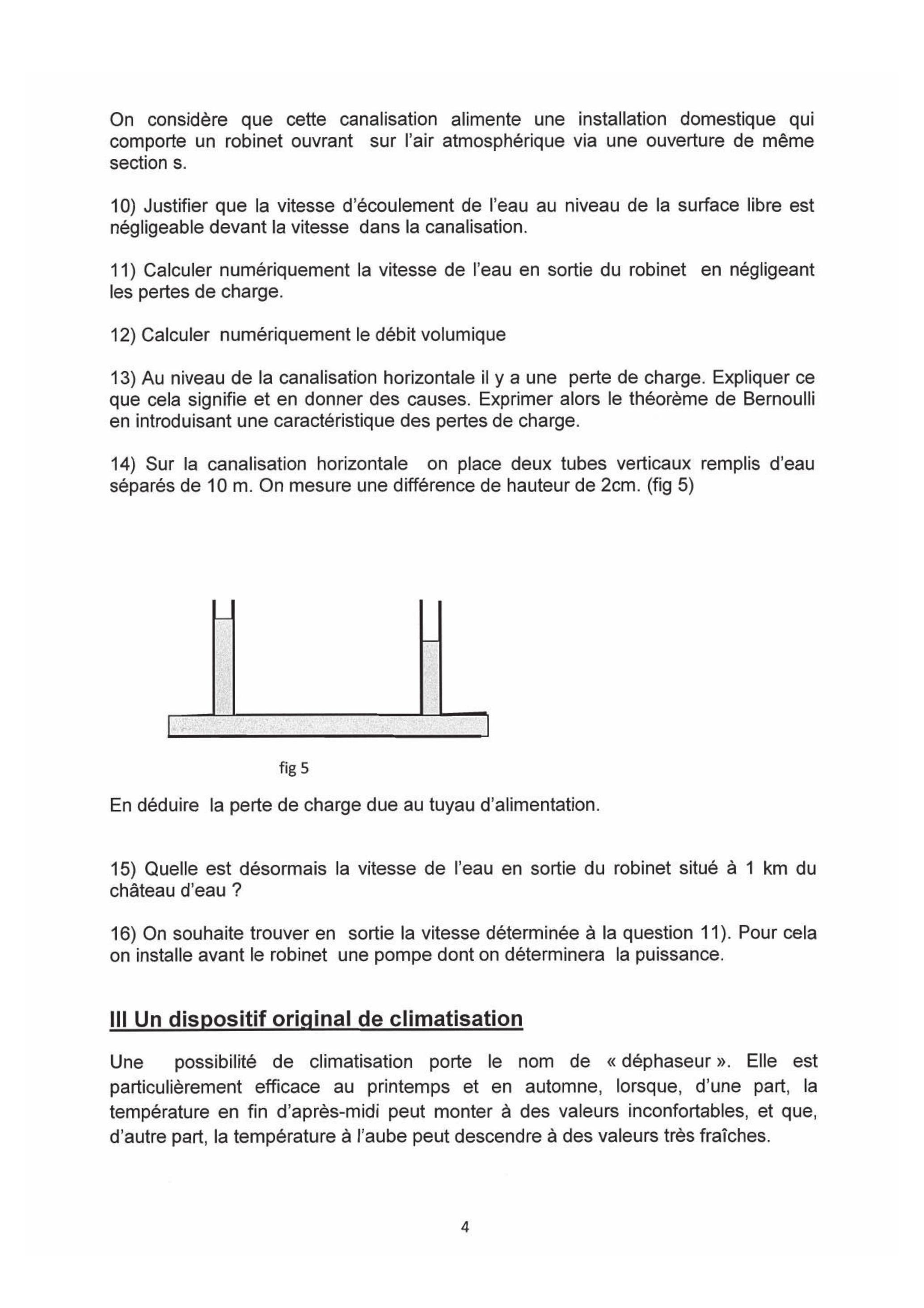 14) Sur la canalisation horizontale on place deux tubes verticaux remplis d'eau séparés de 10 m . On mesure une différence de hauteur de 2 cm . (fig 5)