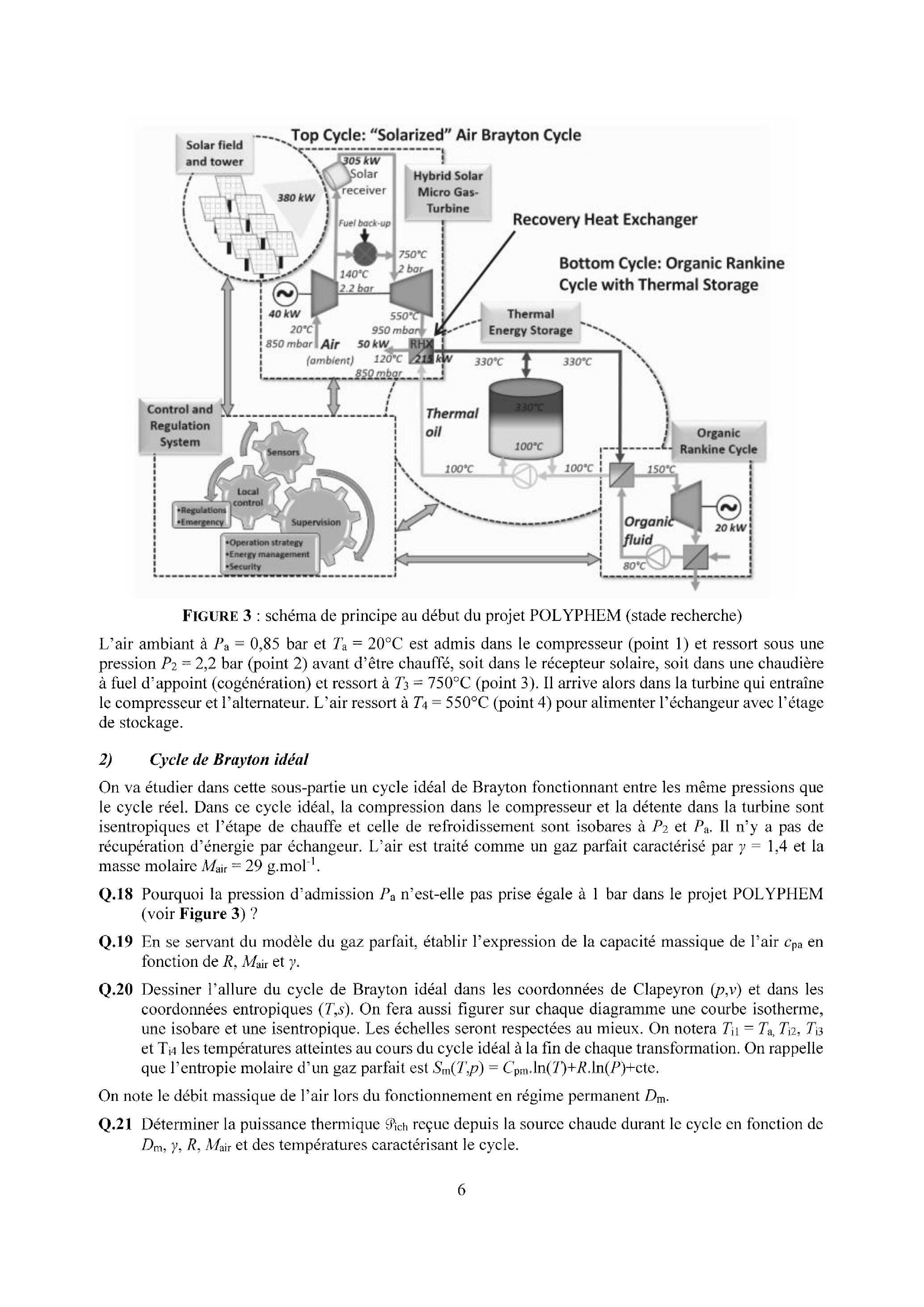 L'air ambiant à bar et est admis dans le compresseur (point 1) et ressort sous une pression bar (point 2 ) avant d'être chauffé, soit dans le récepteur solaire, soit dans une chaudière à fuel d'appoint (cogénération) et ressort à (point 3 ). Il arrive alors dans la turbine qui entraîne le compresseur et l'alternateur. L'air ressort à (point 4) pour alimenter l'échangeur avec l'étage de stockage.