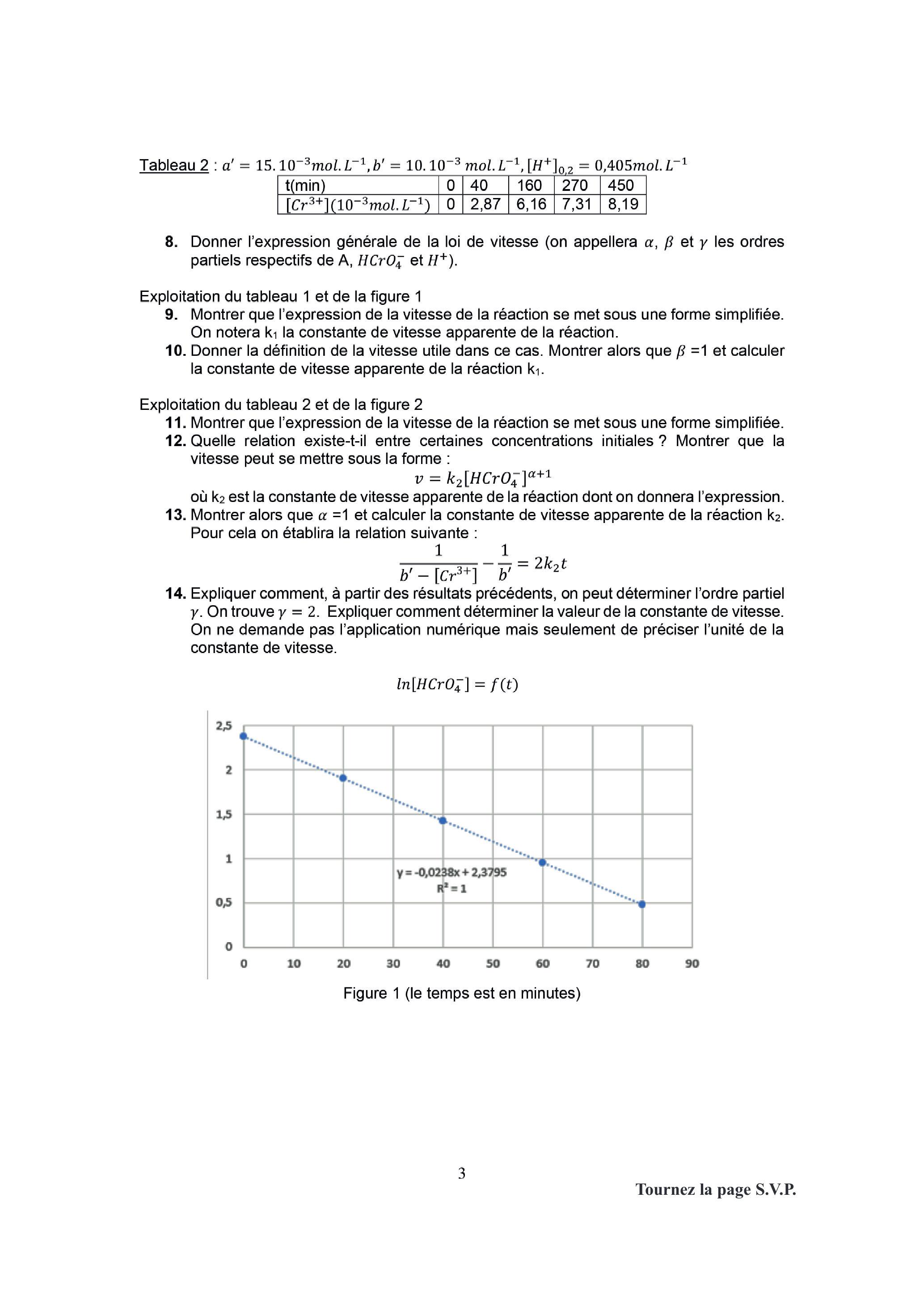 13. Montrer alors que et calculer la constante de vitesse apparente de la réaction . Pour cela on établira la relation suivante :