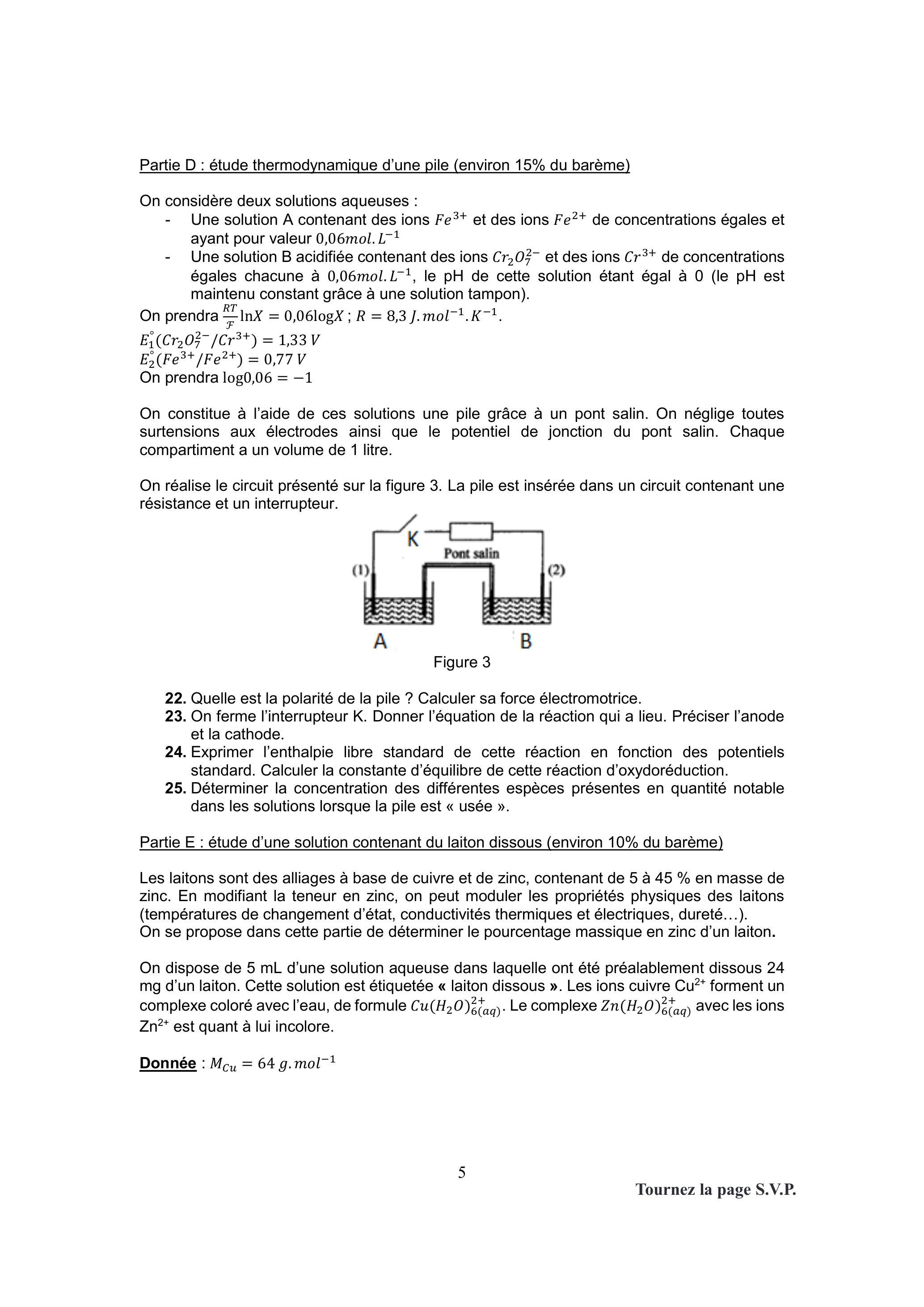 On constitue à l'aide de ces solutions une pile grâce à un pont salin. On néglige toutes surtensions aux électrodes ainsi que le potentiel de jonction du pont salin. Chaque compartiment a un volume de 1 litre.