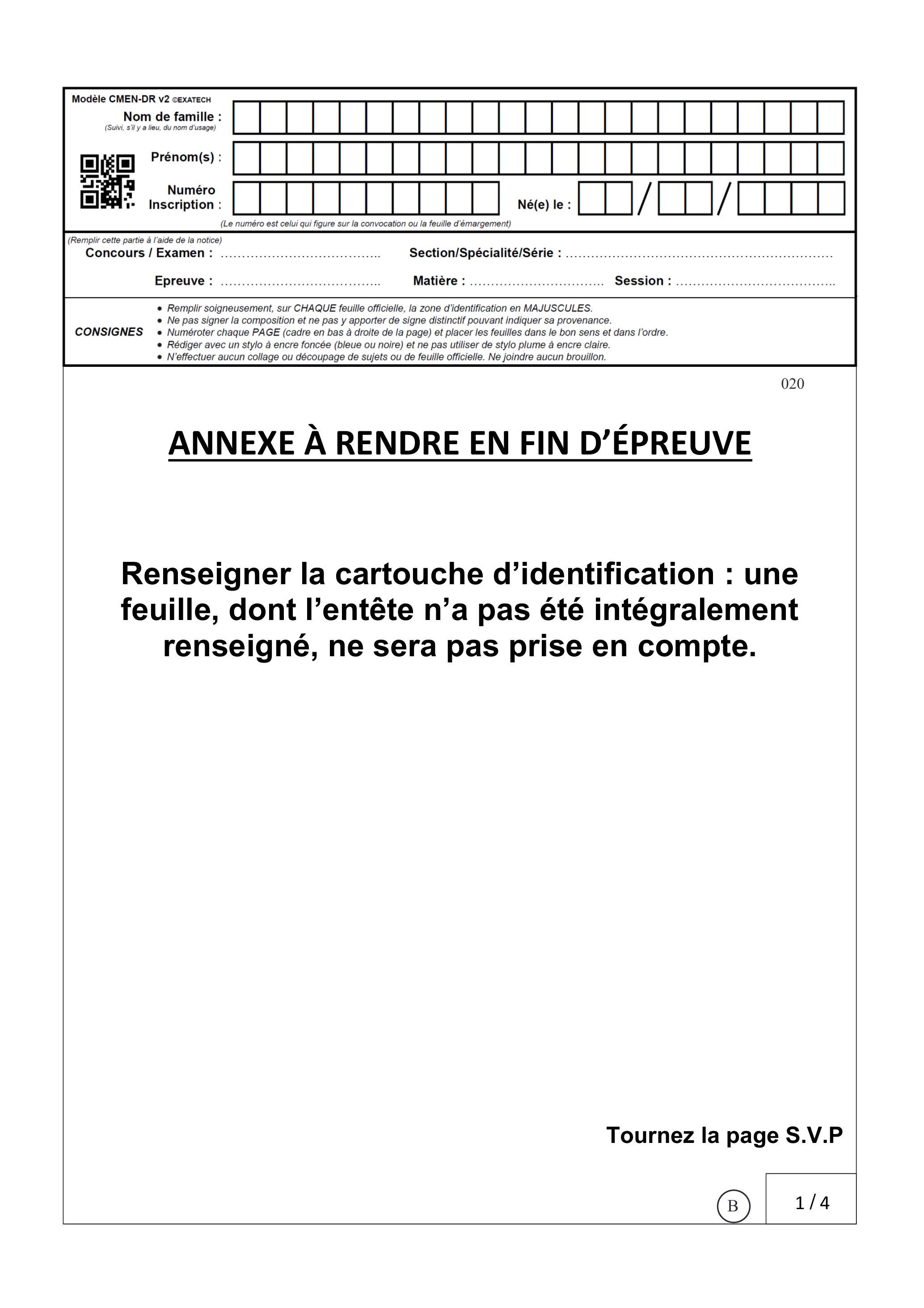 Renseigner la cartouche d'identification : une feuille, dont l'entête n'a pas été intégralement renseigné, ne sera pas prise en compte.