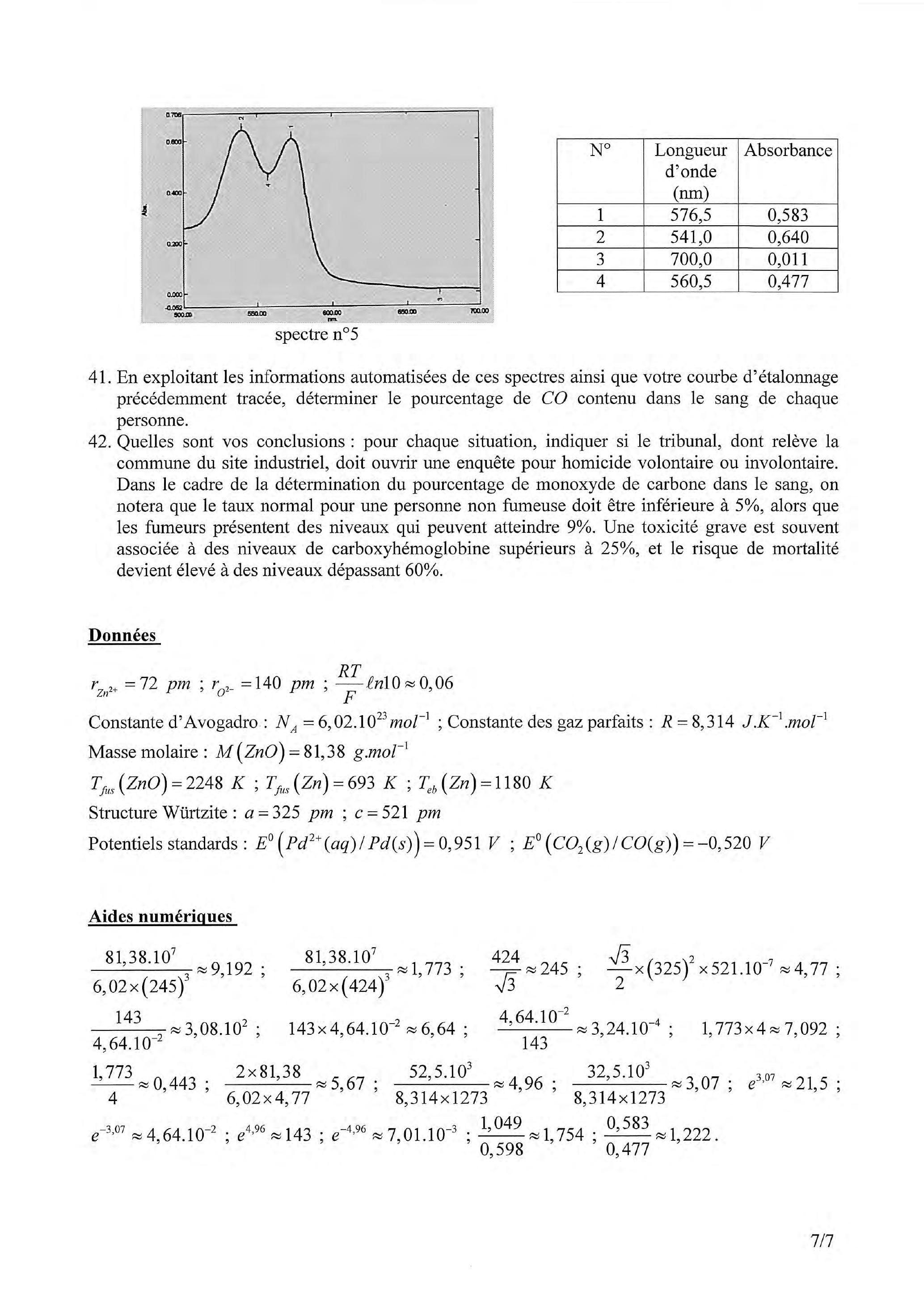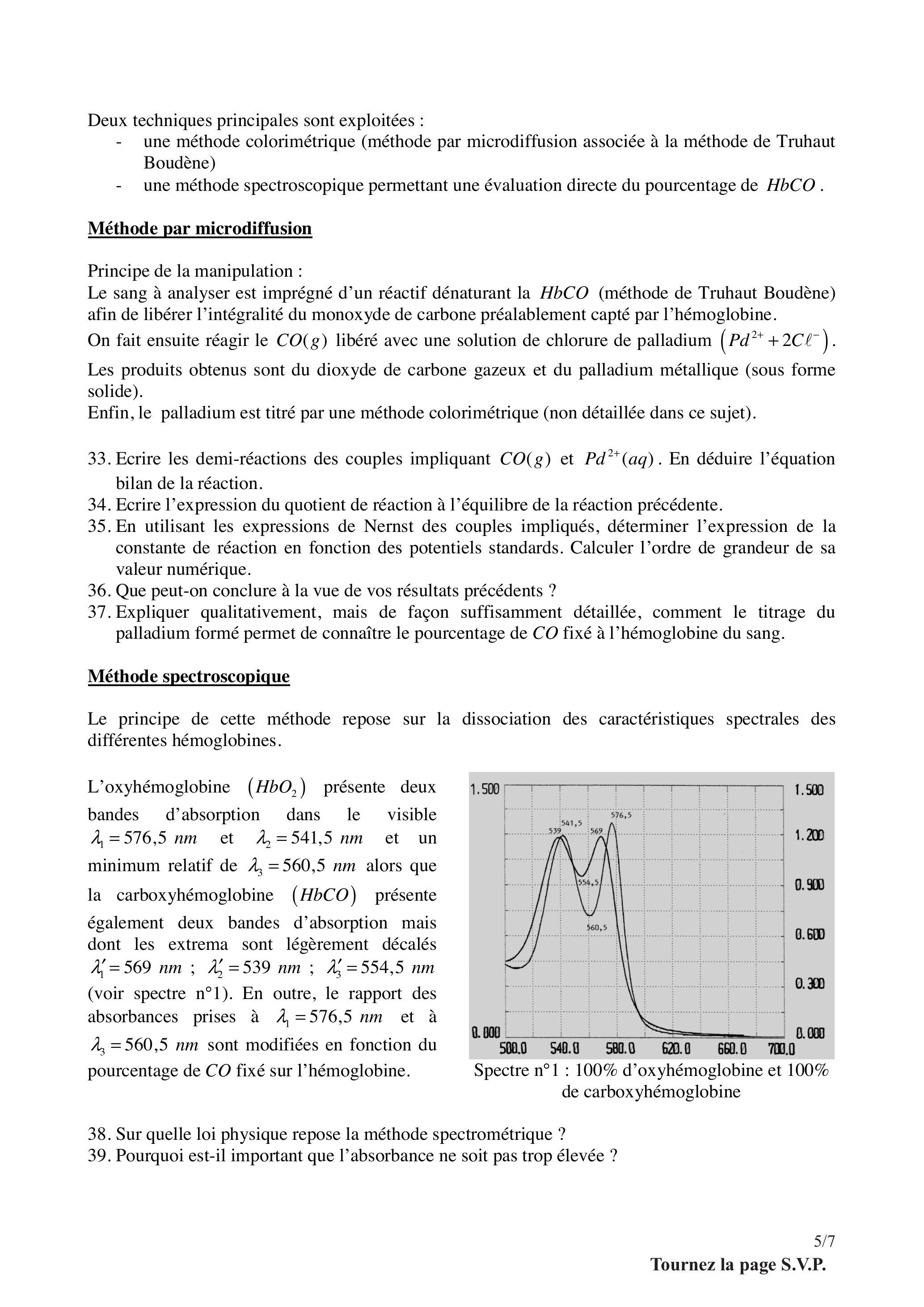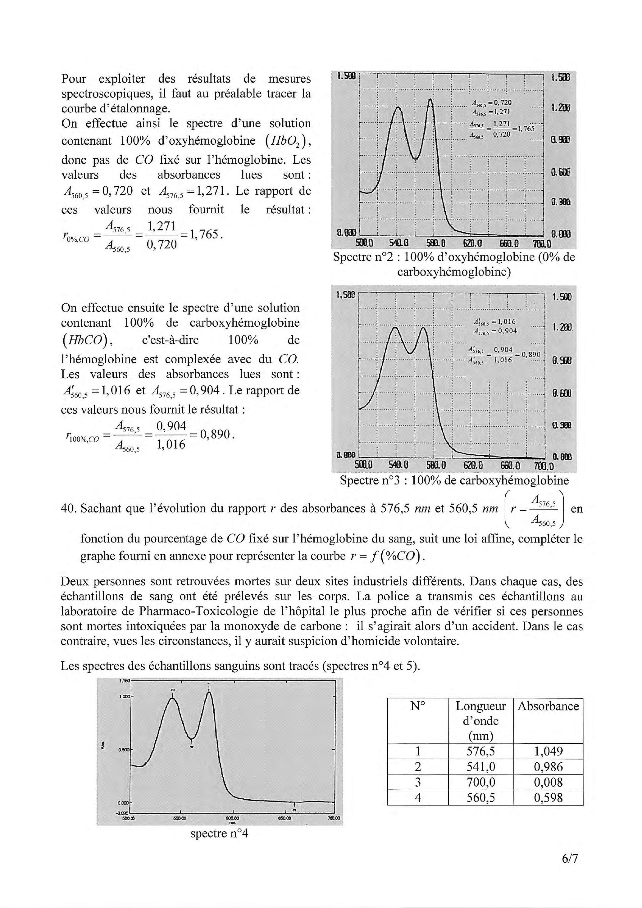 On effectue ainsi le spectre d'une solution contenant d'oxyhémoglobine ( ), donc pas de fixé sur l'hémoglobine. Les valeurs des absorbances lues sont: et . Le rapport de ces valeurs nous fournit le résultat: .