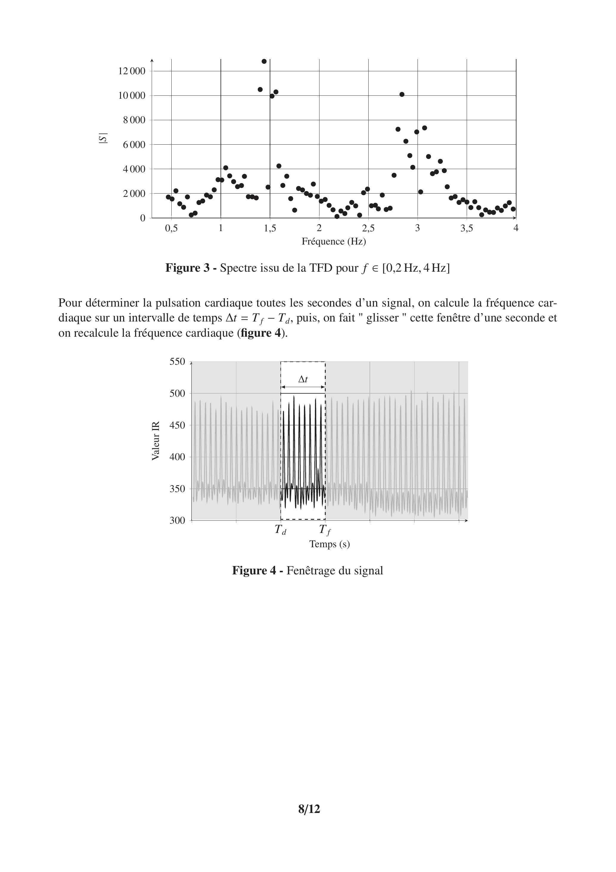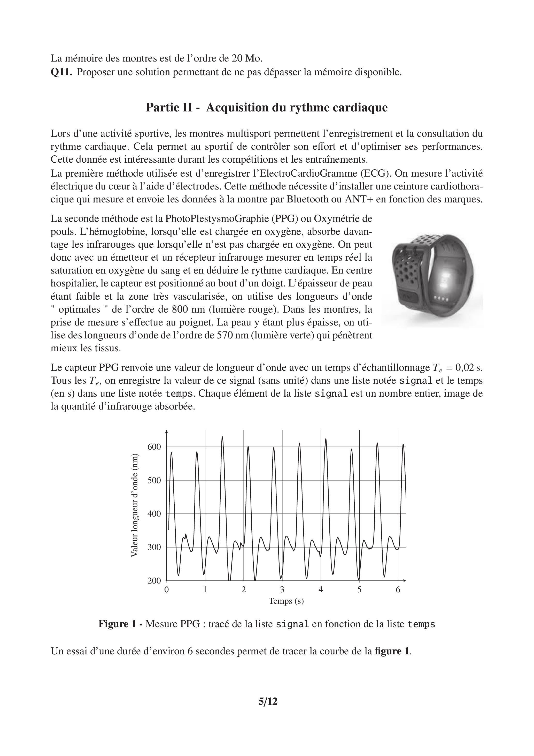 Le capteur PPG renvoie une valeur de longueur d'onde avec un temps d'échantillonnage . Tous les , on enregistre la valeur de ce signal (sans unité) dans une liste notée signal et le temps (en s) dans une liste notée temps. Chaque élément de la liste signal est un nombre entier, image de la quantité d'infrarouge absorbée.