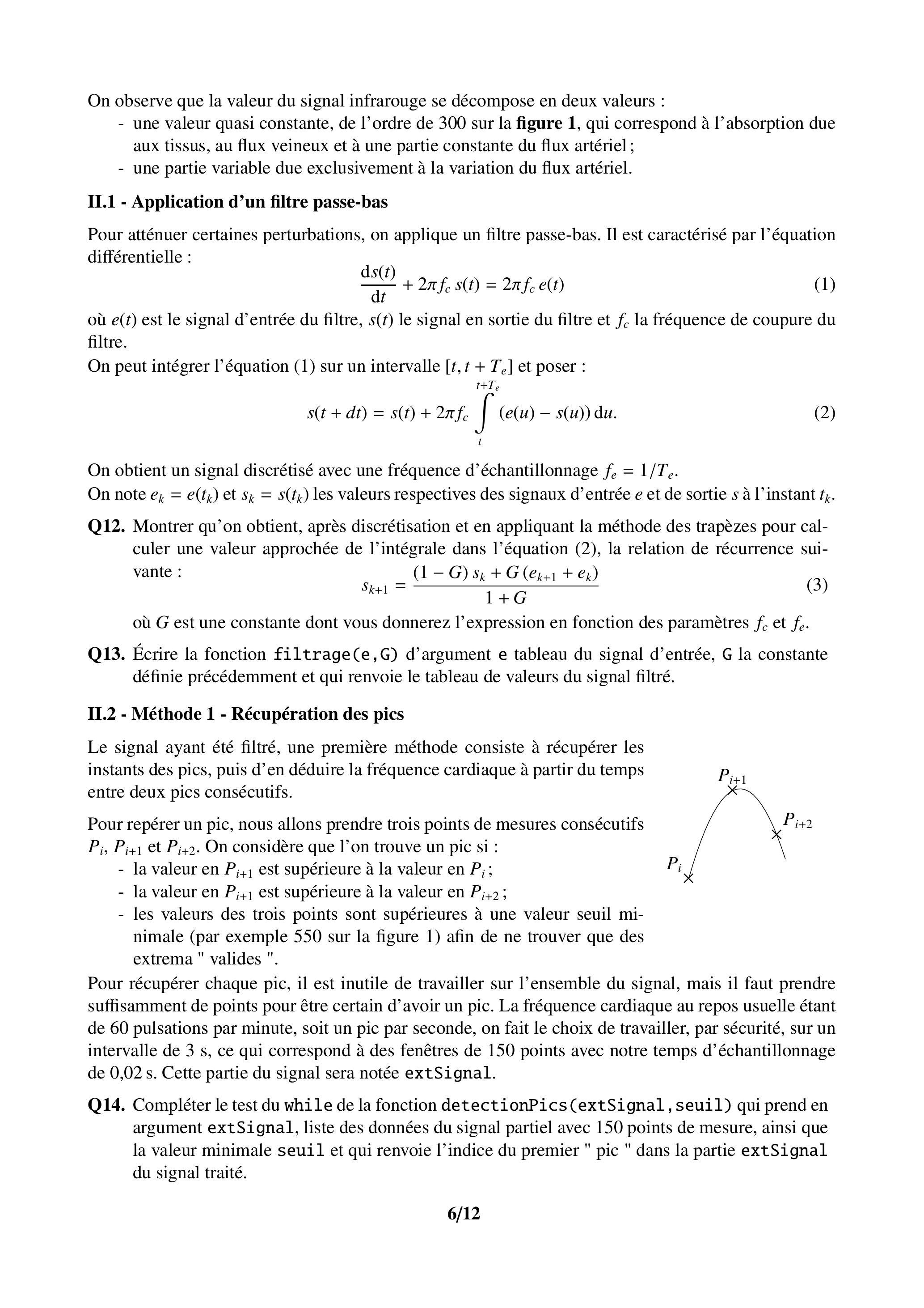 Q15. Commenter précisément la fonction pulsationCardiaque(signal, Te, seuil) qui prend en argument signal, liste des données du signal complet, Te le temps d'échantillonnage en seconde et seuil la valeur du seuil de détection. Expliciter ce que représente la valeur renvoyée.