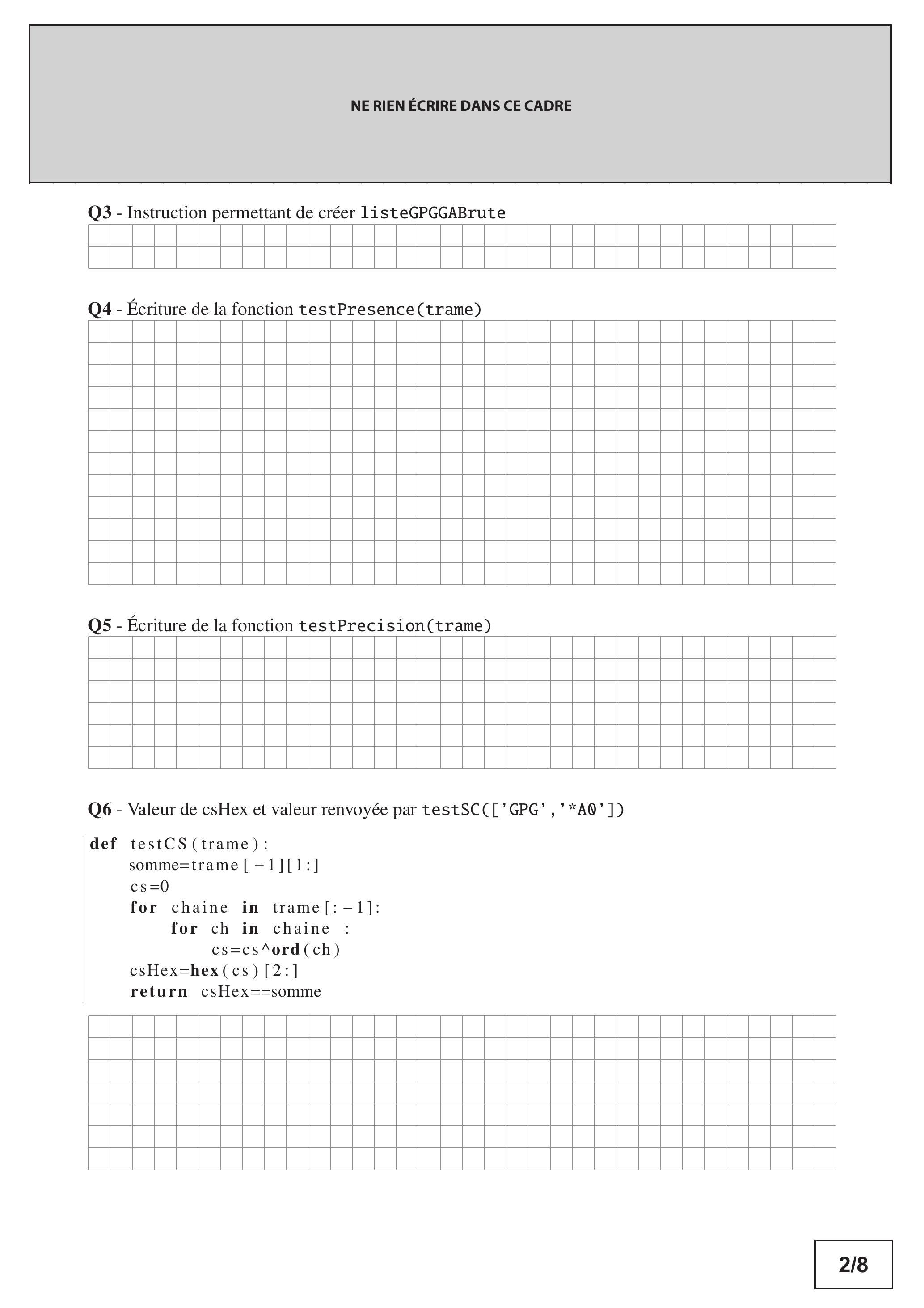 On donne dans le Document Réponse une fonction testSC(trame) qui prend la liste de chaînes de caractères trame correspondant à une trame GPGGA et qui renvoie True si la trame est valide, False sinon.