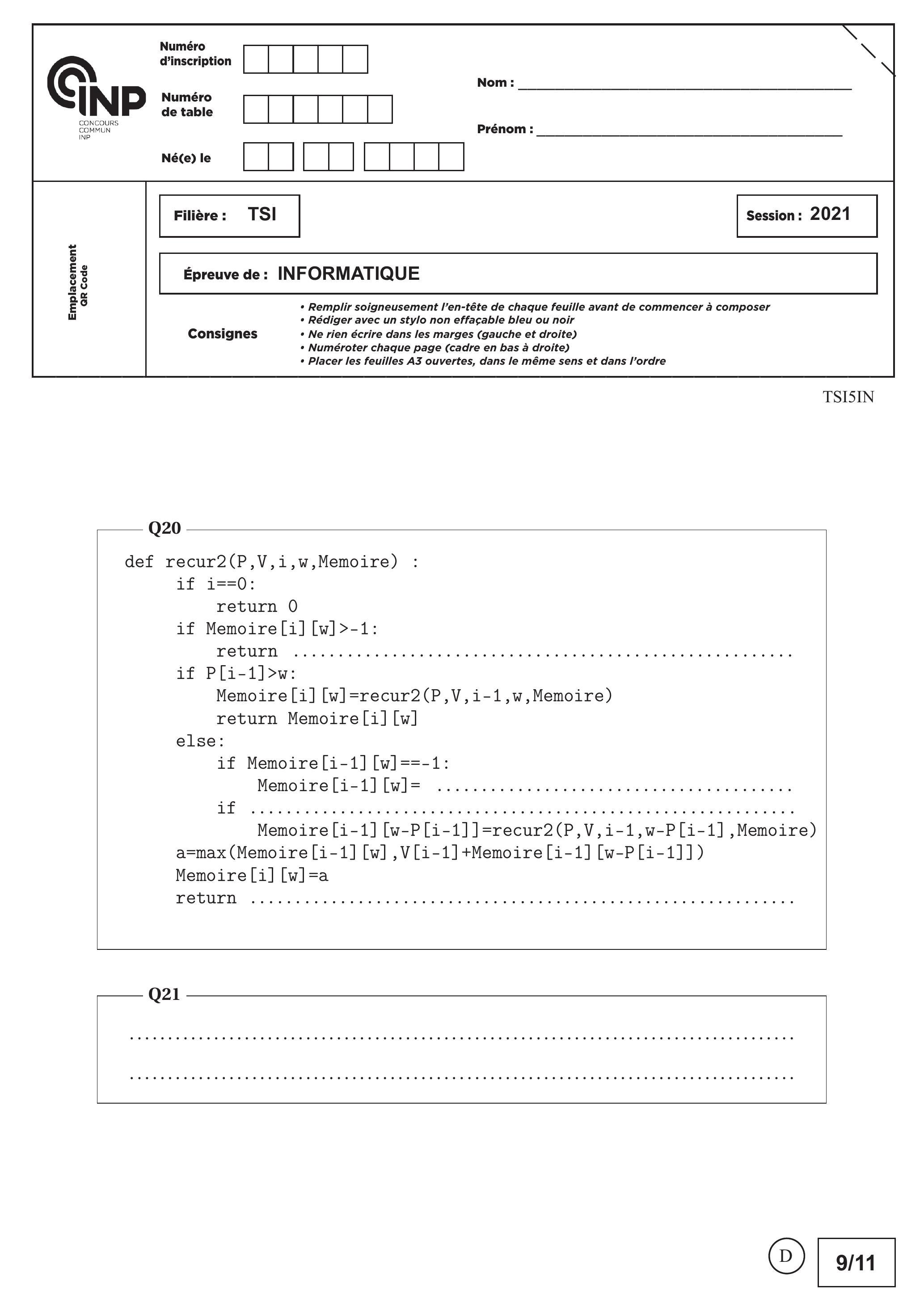 Q20. Compléter la fonction recur2 en suivant le principe expliqué et permettant d'améliorer la fonction recur. La variable Memoire sera utilisée comme une variable globale.