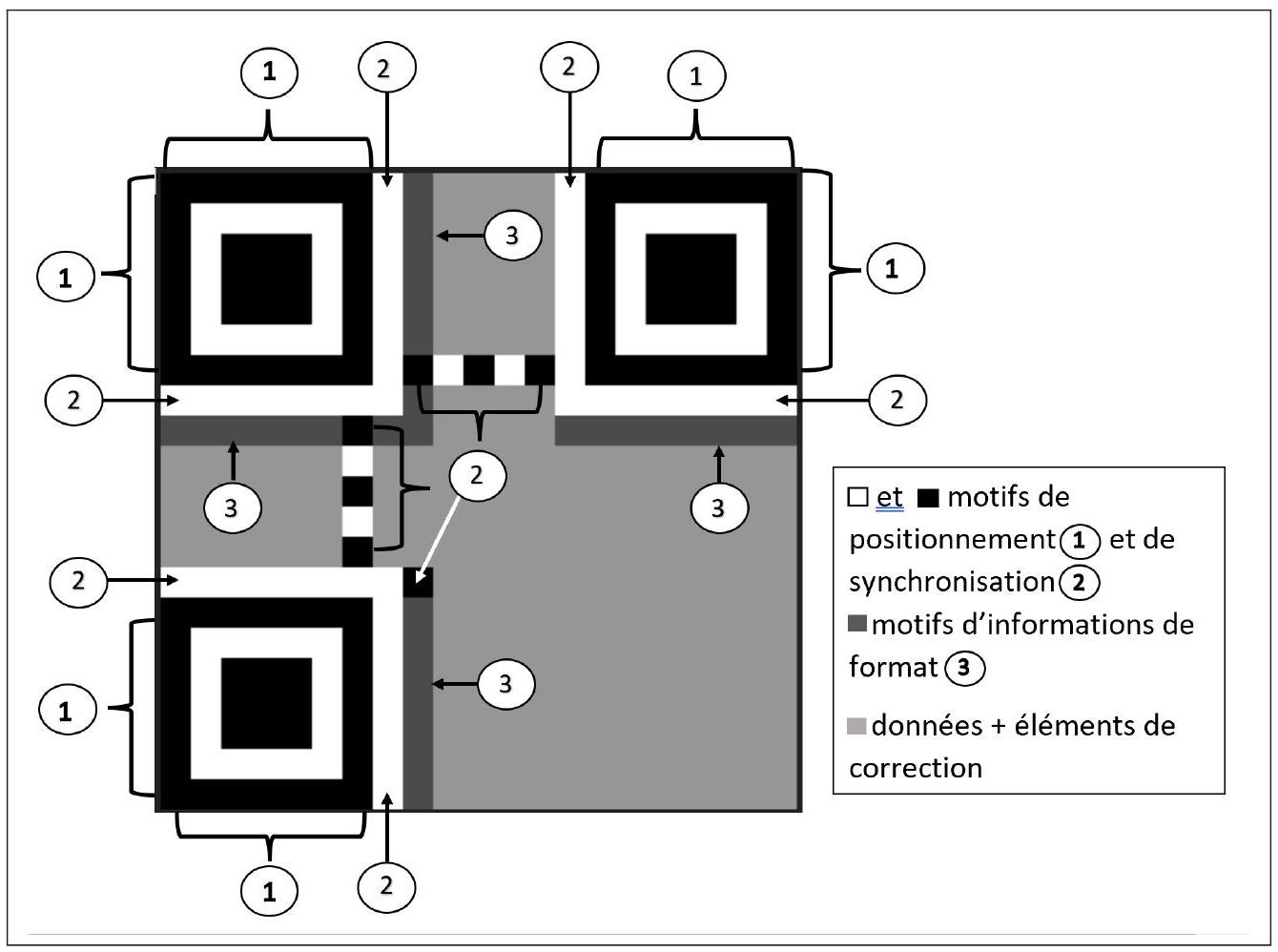 pixels), des motifs de synchronisation (6 zones blanches de séparation et 11 pixels de couleur blanc et noir), des motifs de format d'information et une zone comprenant les données utilisateurs avec des motifs de correction (figure 2).