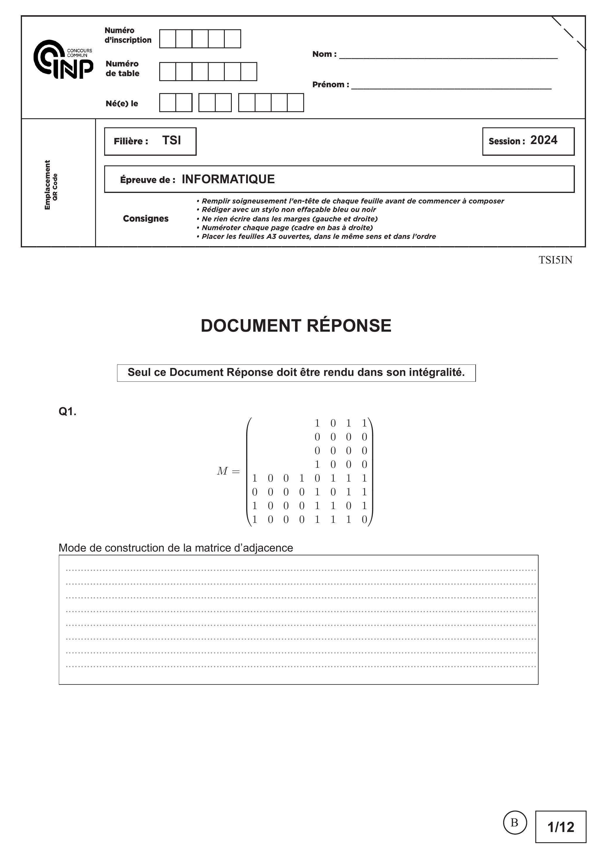 Seul le Document Réponse (DR) doit être rendu dans son intégralité (le QR Code doit être collé sur la première page du Document Réponse).