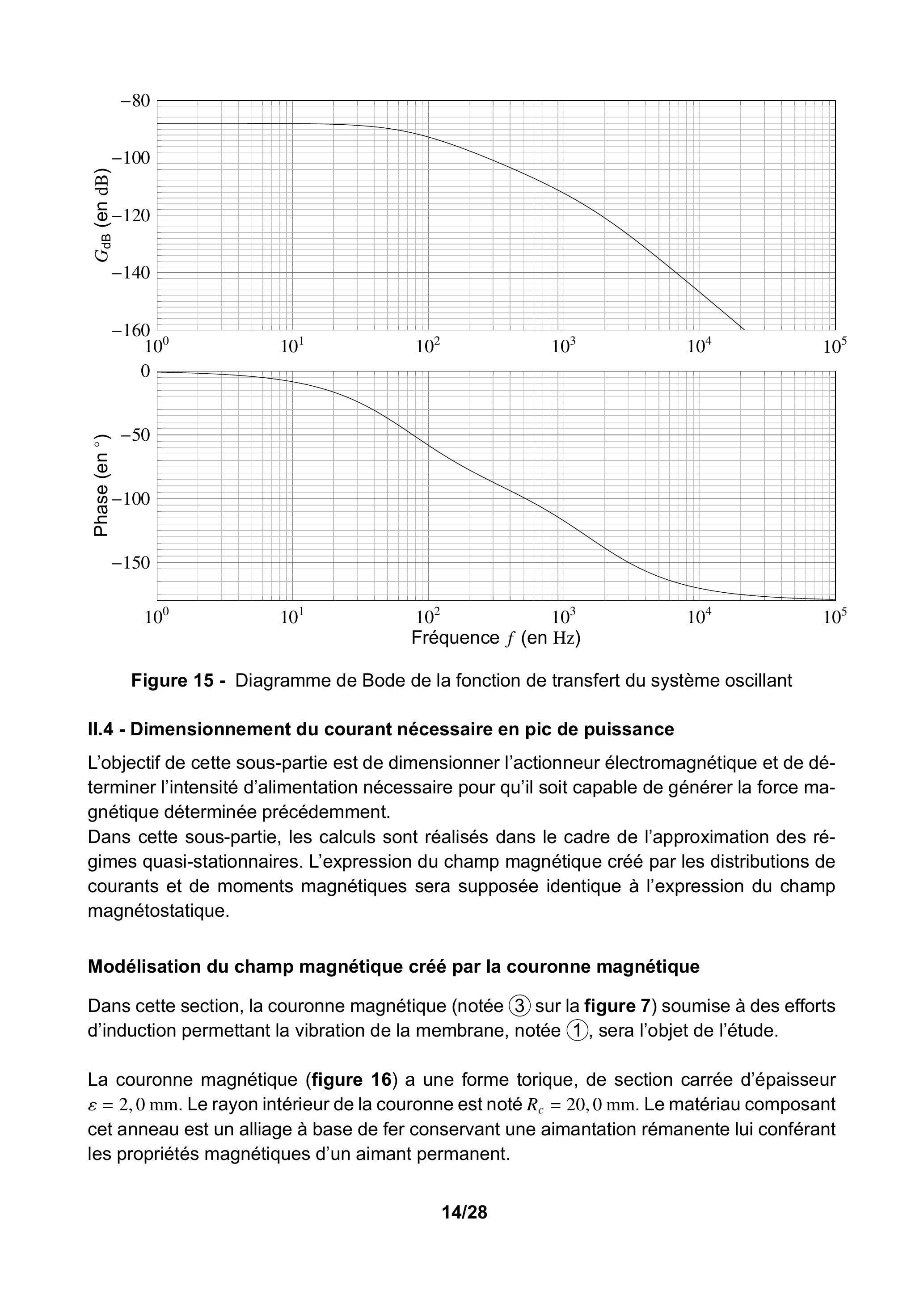 Q41. est défini comme le gain de la fonction de transfert . À partir du diagramme de Bode en gain (figure 26) et en travaillant dans la plage de fonctionnement du système, montrer que peut s'écrire sous la forme . Le diagramme de Bode asymptotique est supposé confondu avec le diagramme de Bode réel sur la plage de fréquences étudiée.