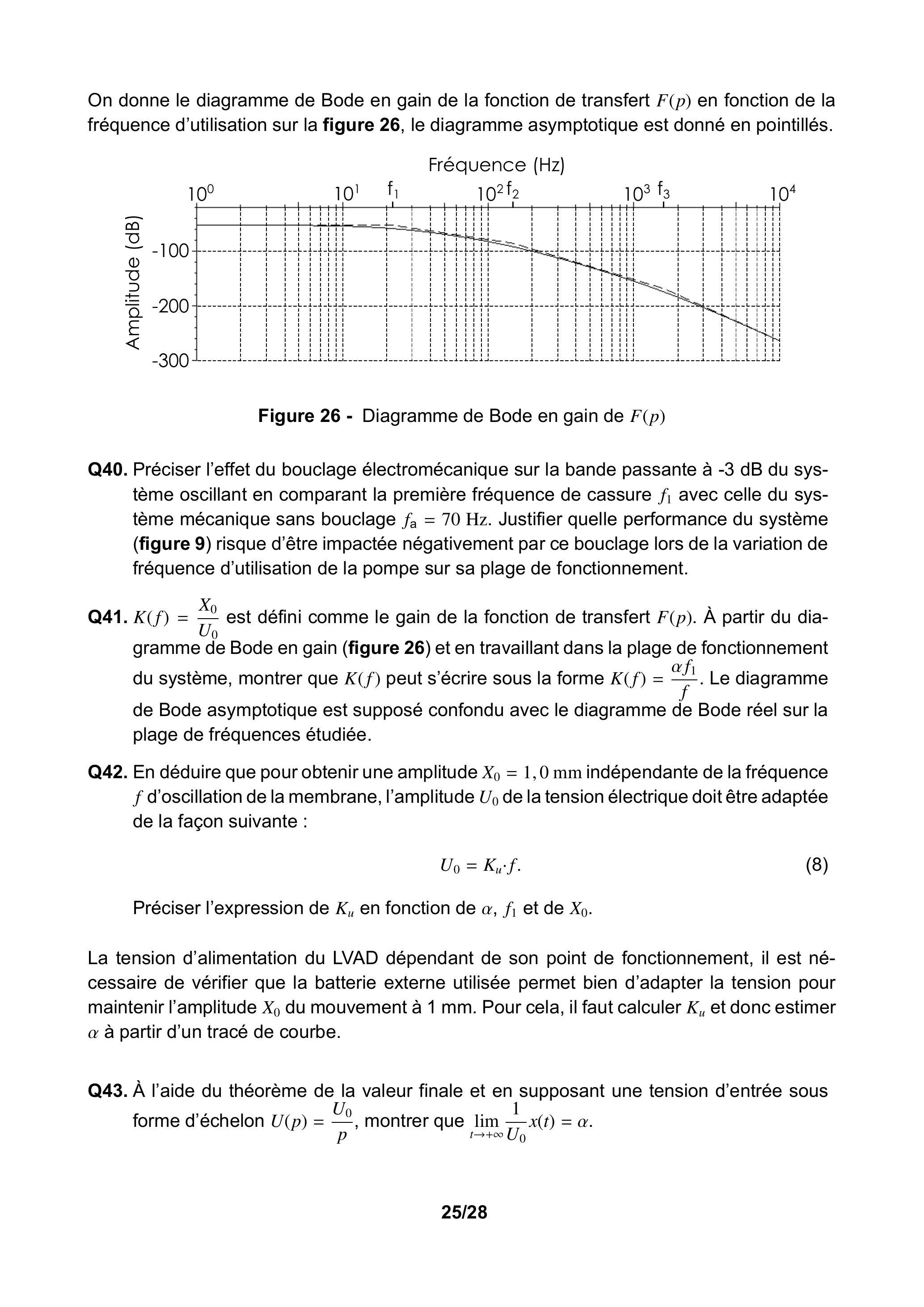 Q40. Préciser l'effet du bouclage électromécanique sur la bande passante à -3 dB du système oscillant en comparant la première fréquence de cassure avec celle du système mécanique sans bouclage . Justifier quelle performance du système (figure 9) risque d'être impactée négativement par ce bouclage lors de la variation de fréquence d'utilisation de la pompe sur sa plage de fonctionnement.