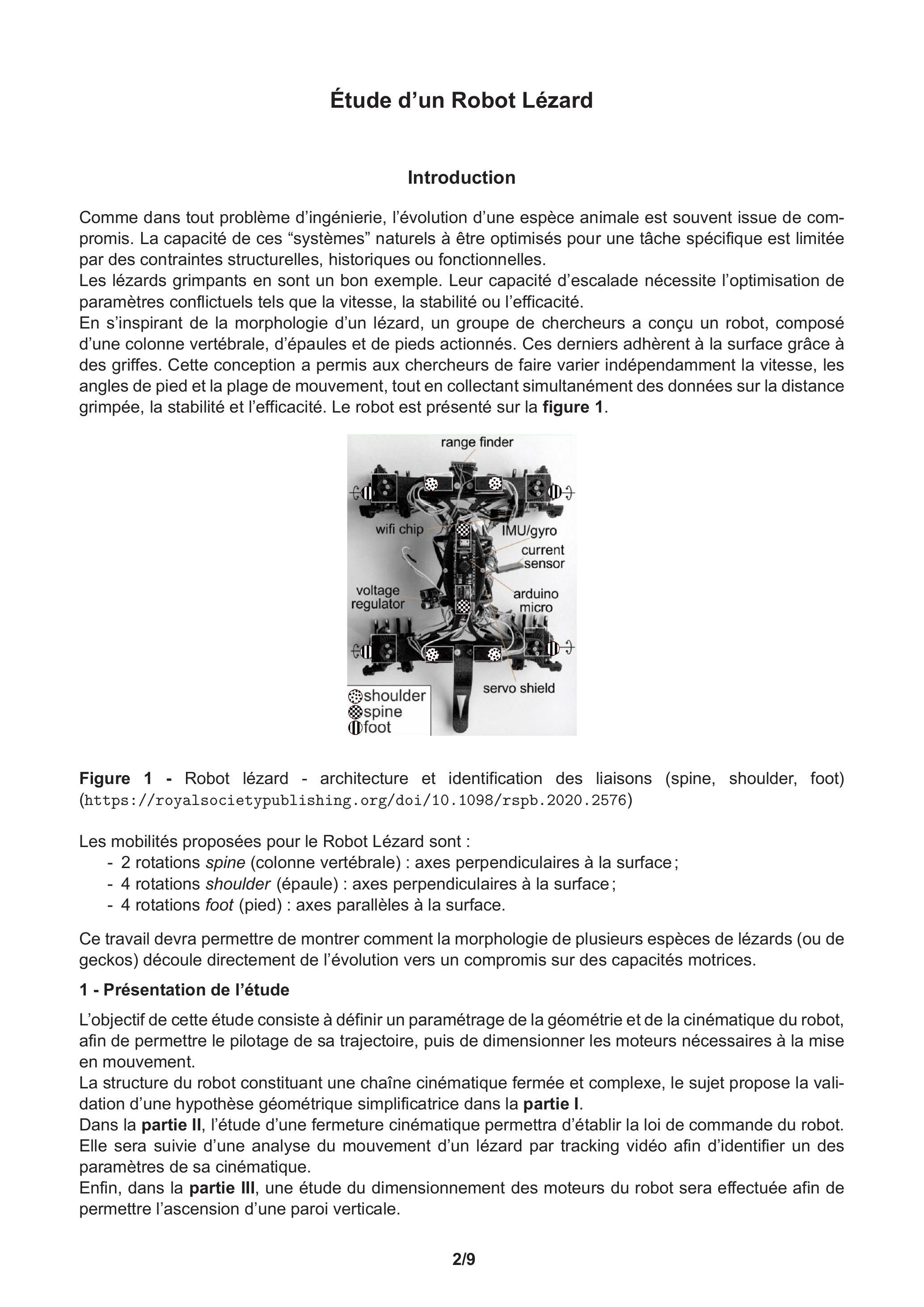 Dans la partie II, l'étude d'une fermeture cinématique permettra d'établir la loi de commande du robot. Elle sera suivie d'une analyse du mouvement d'un lézard par tracking vidéo afin d'identifier un des paramètres de sa cinématique.