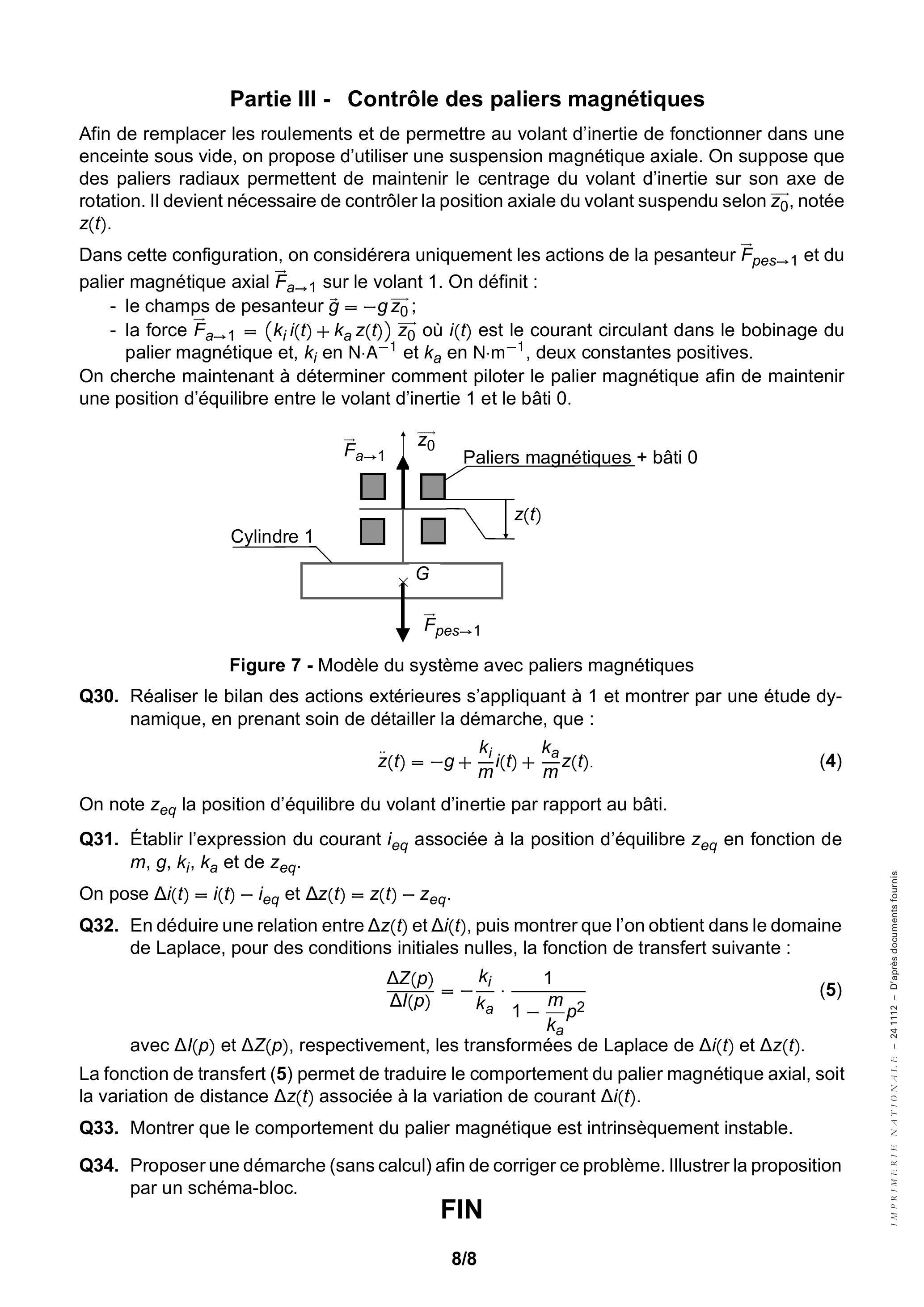 Dans cette configuration, on considérera uniquement les actions de la pesanteur et du palier magnétique axial sur le volant 1 . On définit :