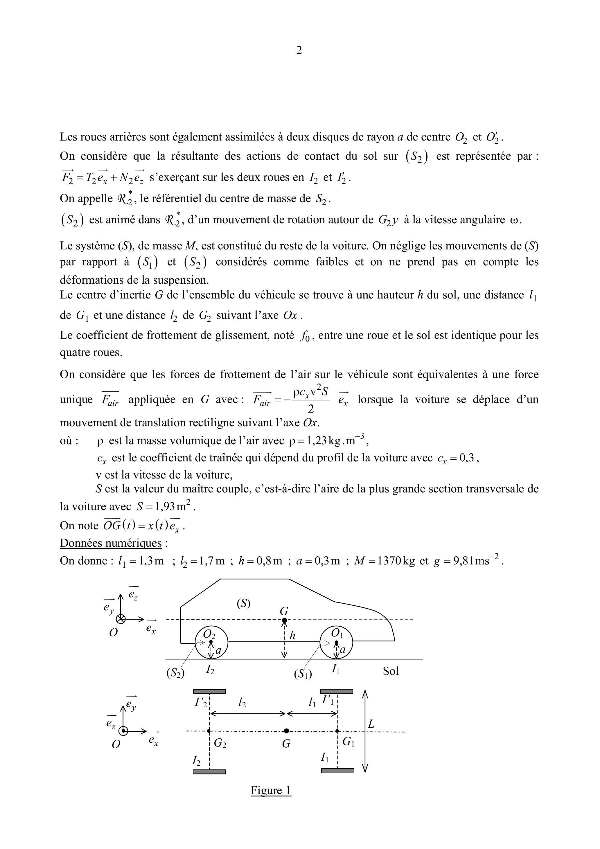 Ce problème étudie les performances en accélération et freinage d'une automobile se déplaçant en ligne droite. On considère le référentiel terrestre associé au repère ( ) comme étant galiléen. On note ( ) le trièdre associé. On considère que la voiture (figure 1) est composée de 3 systèmes notés .