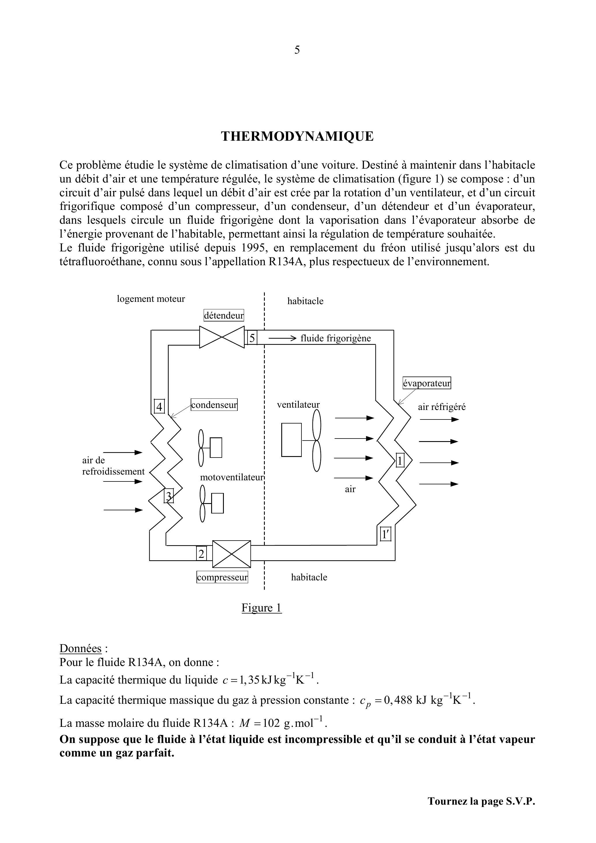 Ce problème étudie le système de climatisation d'une voiture. Destiné à maintenir dans l'habitacle un débit d'air et une température régulée, le système de climatisation (figure 1) se compose : d'un circuit d'air pulsé dans lequel un débit d'air est crée par la rotation d'un ventilateur, et d'un circuit frigorifique composé d'un compresseur, d'un condenseur, d'un détendeur et d'un évaporateur, dans lesquels circule un fluide frigorigène dont la vaporisation dans l'évaporateur absorbe de l'énergie provenant de l'habitable, permettant ainsi la régulation de température souhaitée.