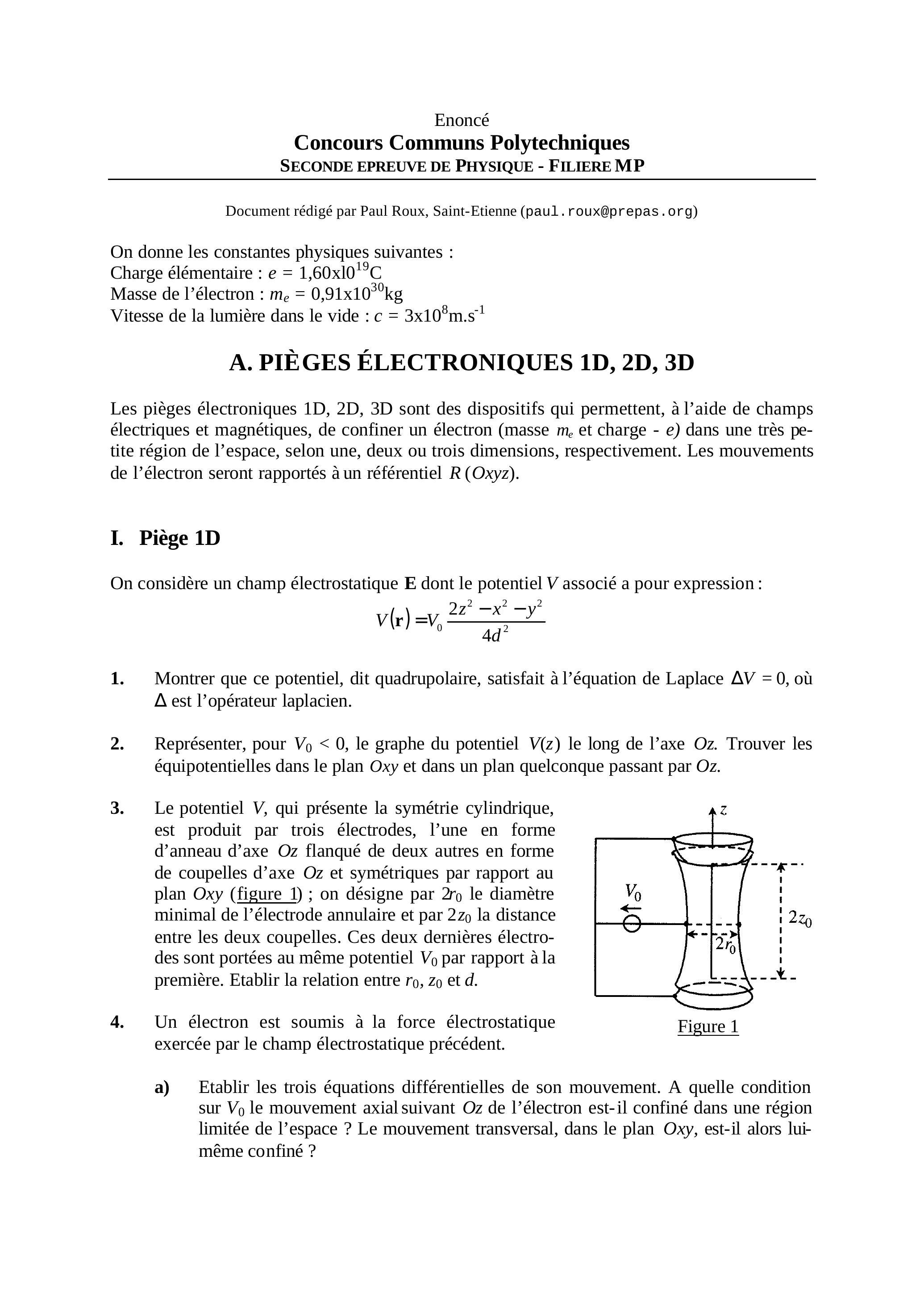 Les pièges électroniques 1D, 2D, 3D sont des dispositifs qui permettent, à l'aide de champs électriques et magnétiques, de confiner un électron (masse et charge ) dans une très petite région de l'espace, selon une, deux ou trois dimensions, respectivement. Les mouvements de l'électron seront rapportés à un référentiel (Oxyz).
