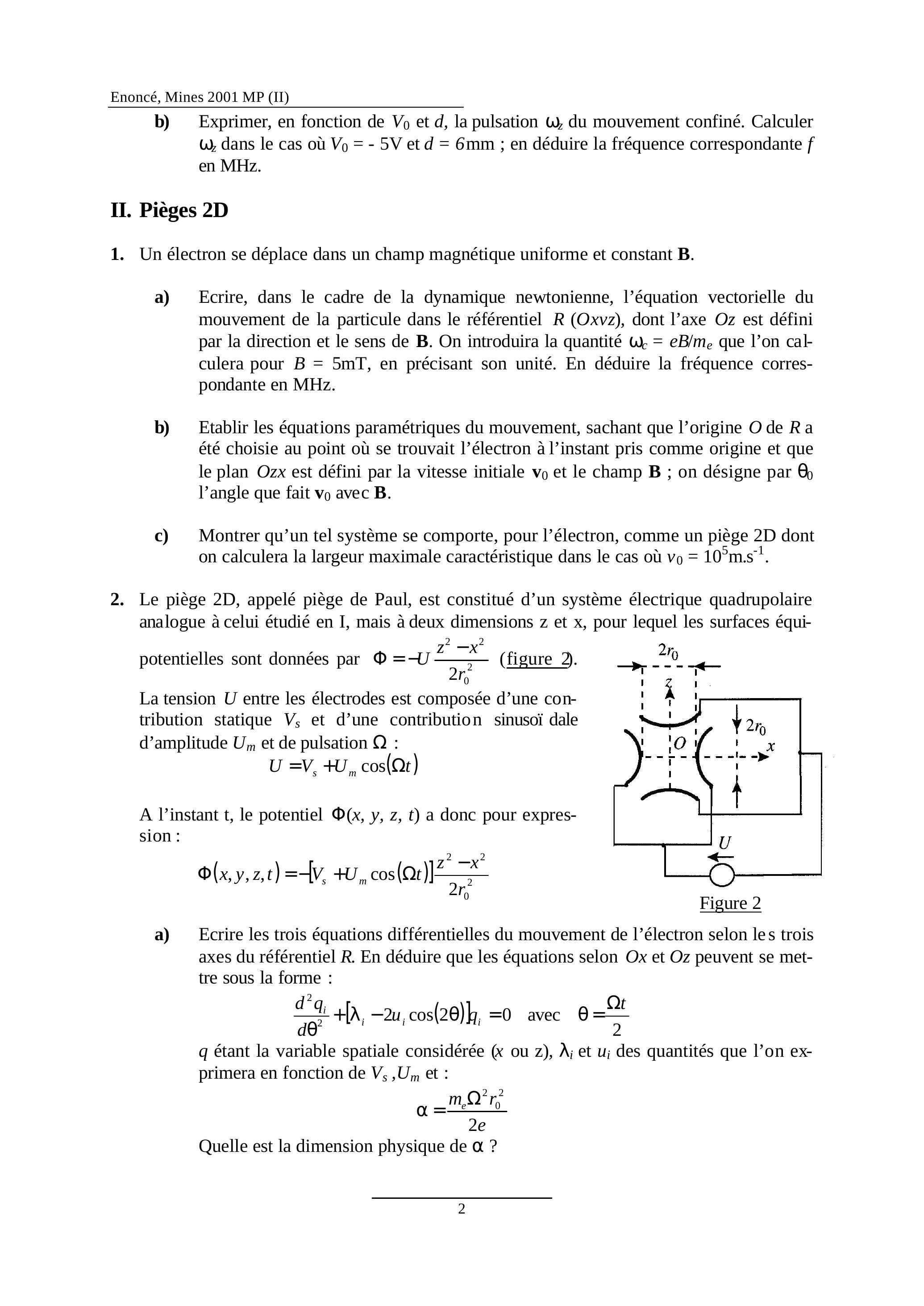 Le piège 2 D , appelé piège de Paul, est constitué d'un système électrique quadrupolaire analogue à celui étudié en I , mais à deux dimensions z et x , pour lequel les surfaces équipotentielles sont données par (figure 2). La tension entre les électrodes est composée d'une contribution statique et d'une contribution sinusoï dale d'amplitude et de pulsation :