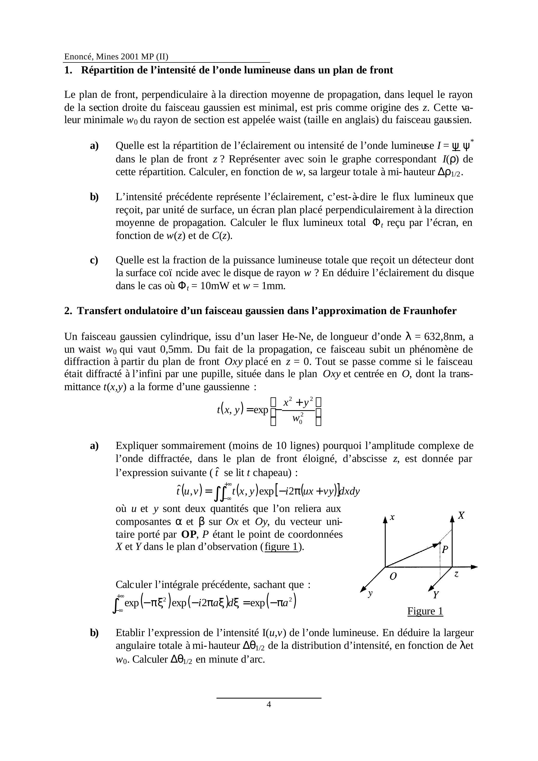 b) L'intensité précédente représente l'éclairement, c'est-àdire le flux lumineux que reçoit, par unité de surface, un écran plan placé perpendiculairement à la direction moyenne de propagation. Calculer le flux lumineux total reçu par l'écran, en fonction de et de .