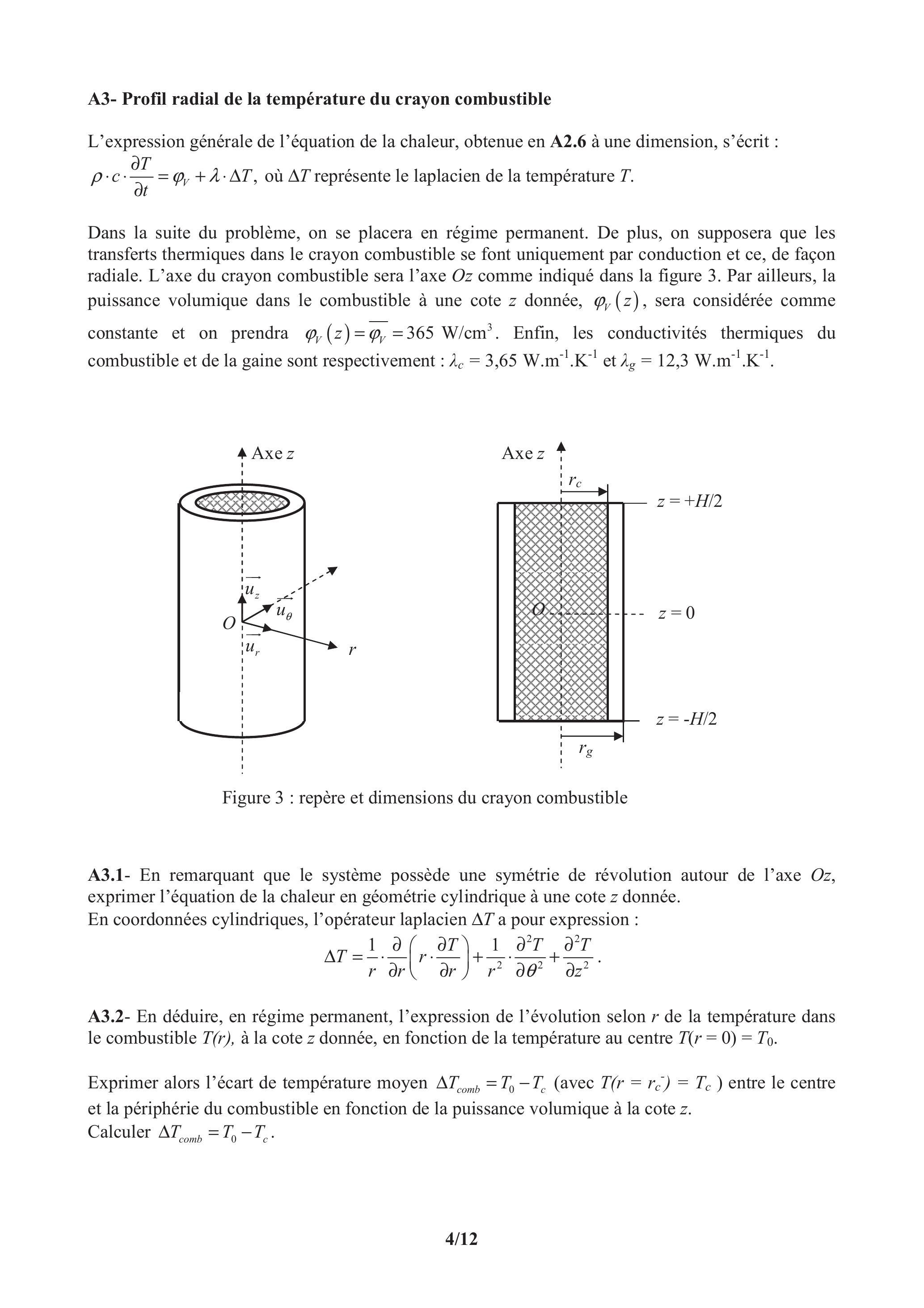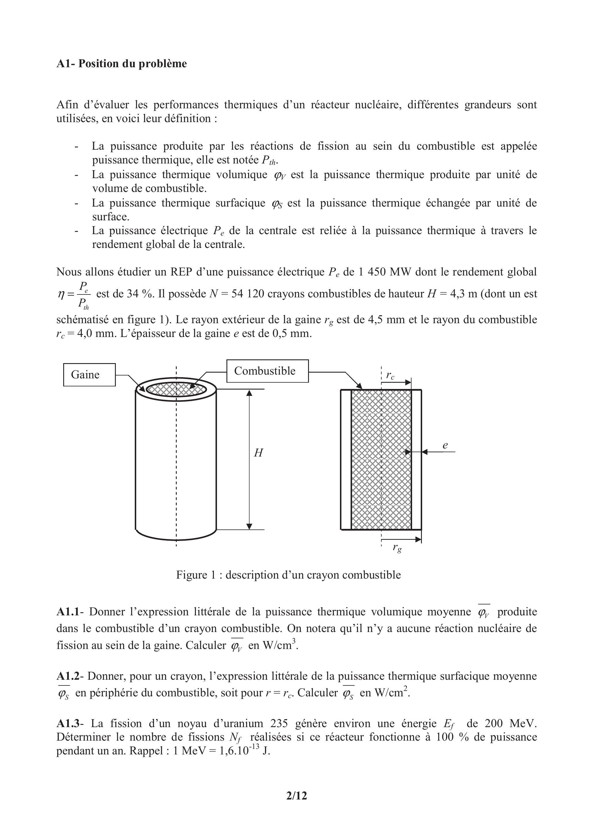 Ce problème a pour objectif d'étudier les aspects thermiques du combustible nucléaire, siège des réactions de fission. Le combustible nucléaire est confiné dans des gaines métalliques cylindriques formant ainsi ce qu'on appelle des «crayons combustibles». Ces derniers sont regroupés en une structure d'allure cylindrique. Cet ensemble de crayons combustibles est appelé «cœur» du réacteur.