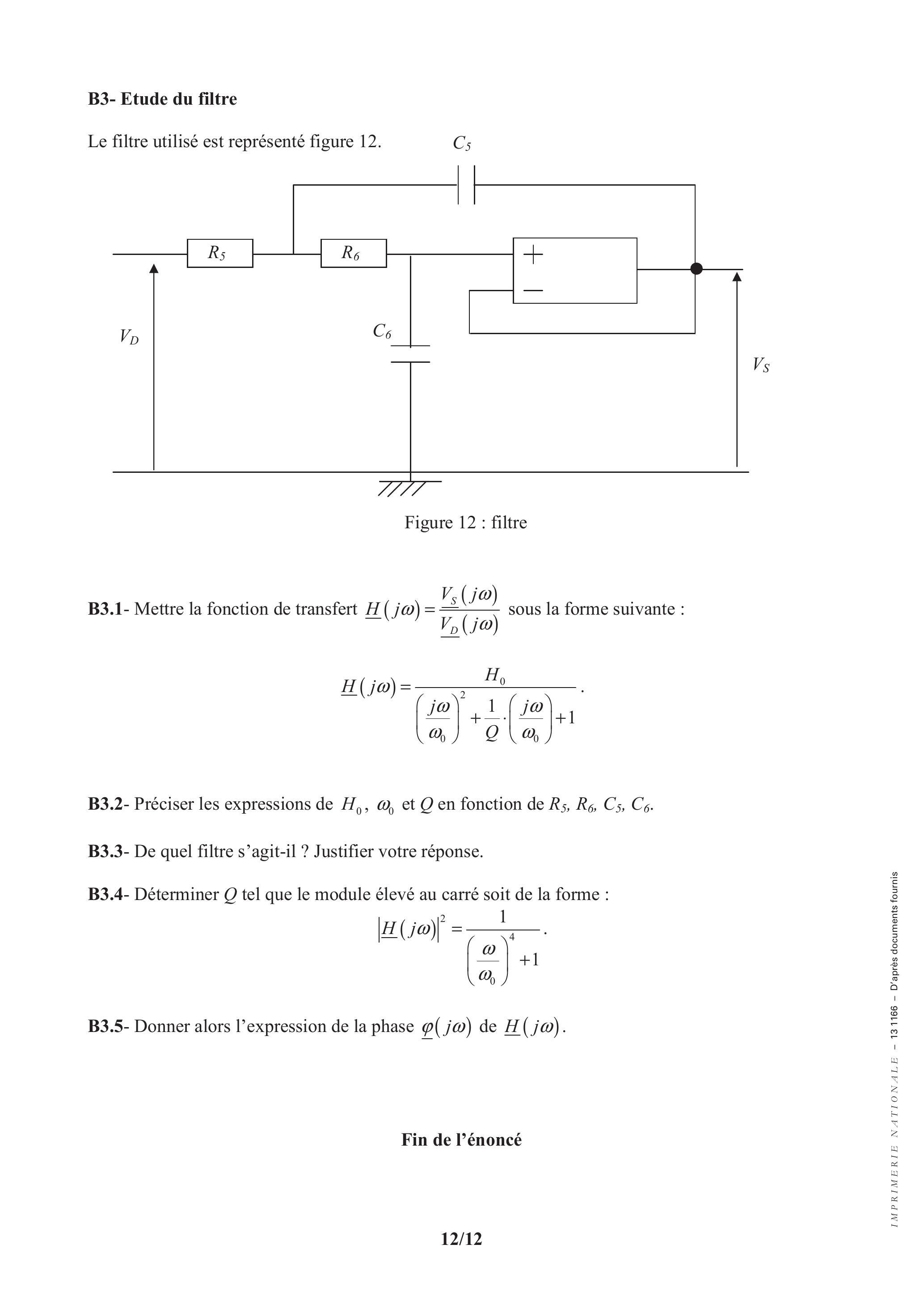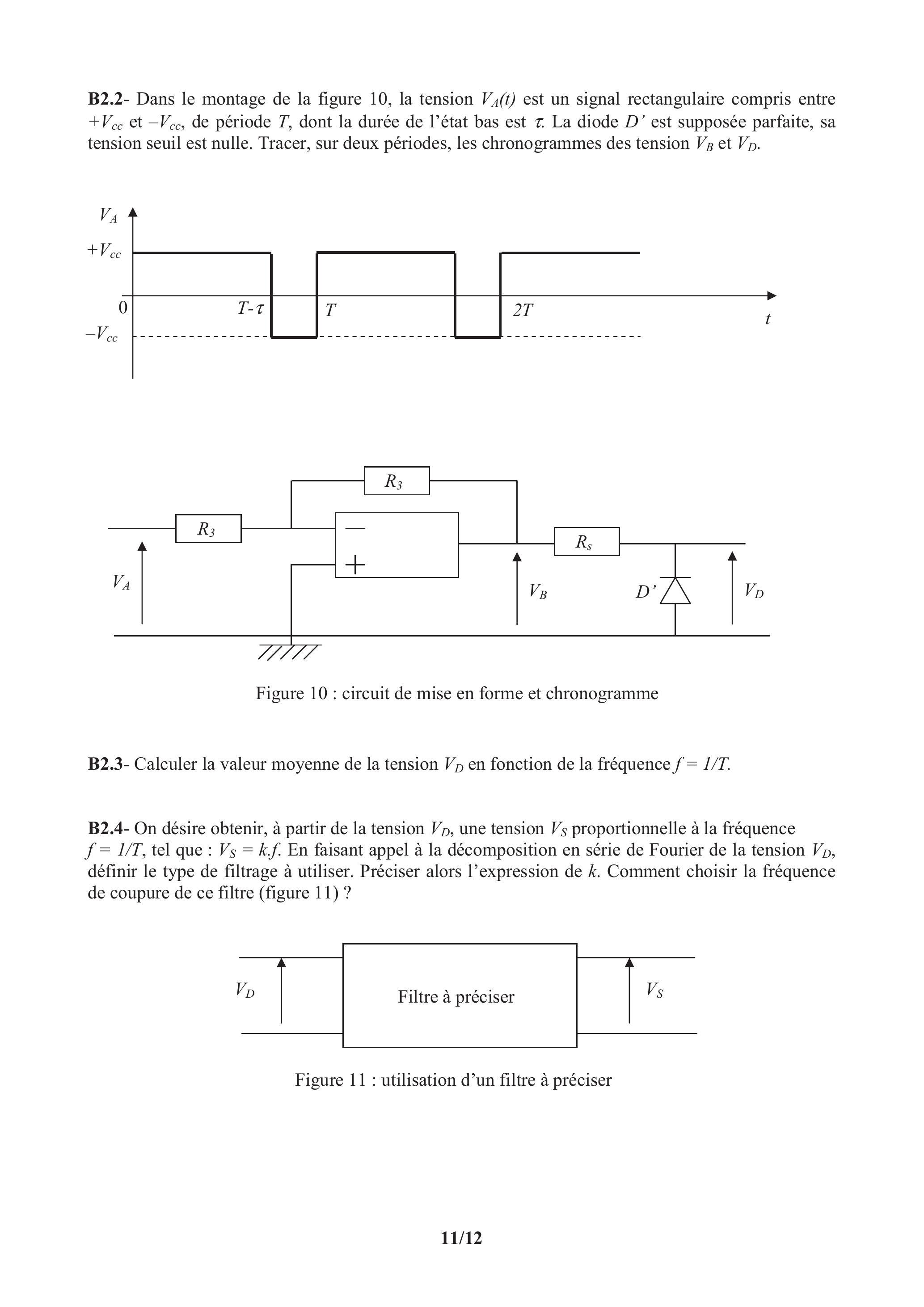 B2.4- On désire obtenir, à partir de la tension , une tension proportionnelle à la fréquence , tel que : . En faisant appel à la décomposition en série de Fourier de la tension , définir le type de filtrage à utiliser. Préciser alors l'expression de . Comment choisir la fréquence de coupure de ce filtre (figure 11) ?