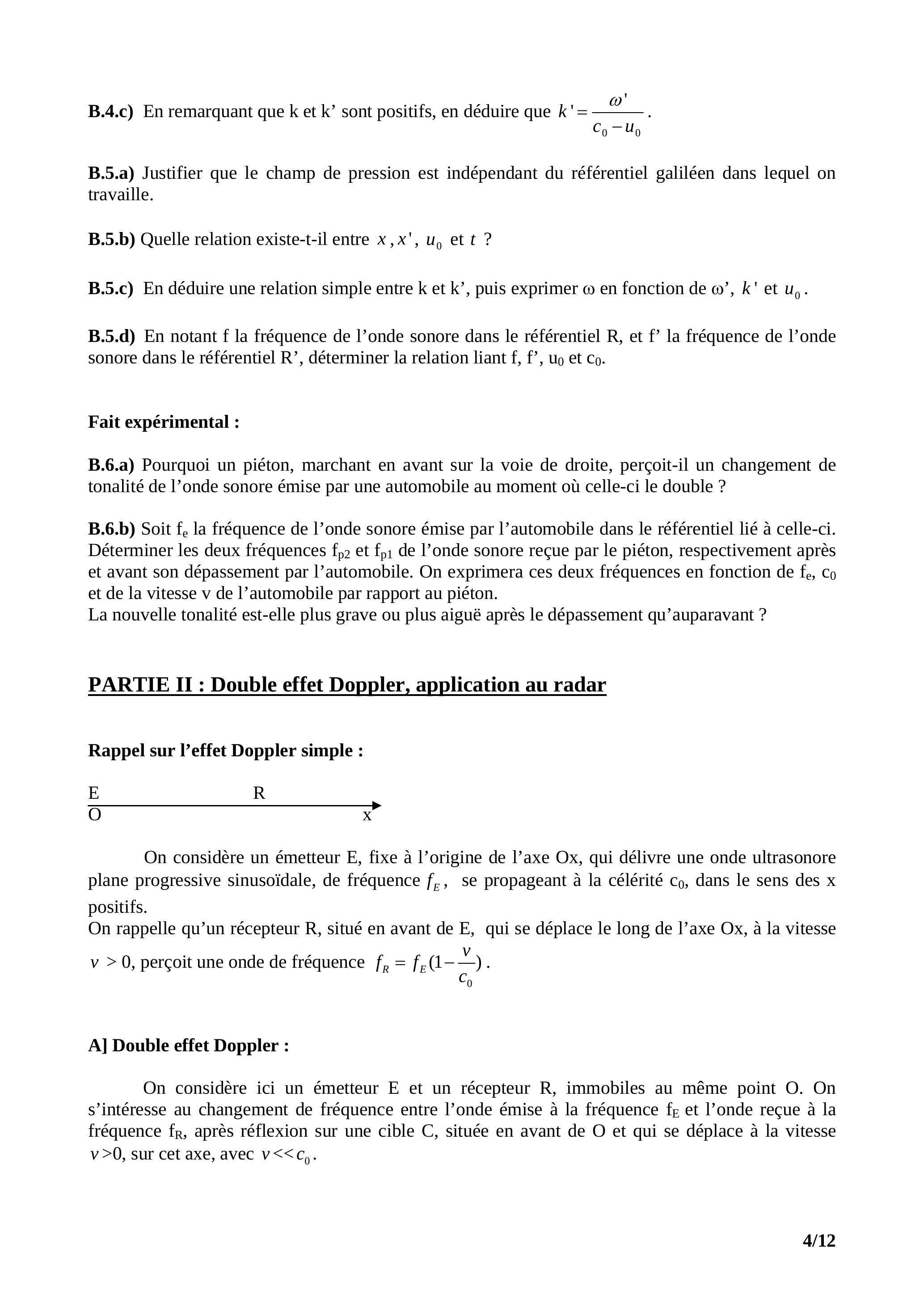 On décrit une onde sonore dans le référentiel (R’) par les grandeurs suivantes, fonction de la position ' et du temps :